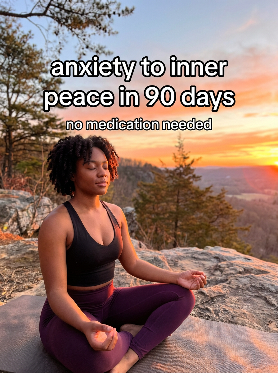 model in yoga outfit in serene outdoor setting, meditation pose, sunrise/sunset lighting, peaceful expression. TikTok-style text overlay with white text with black outline: "anxiety to inner peace in 90 days" smaller text: "(no medication needed)" , do not show tiktok interface or logo
