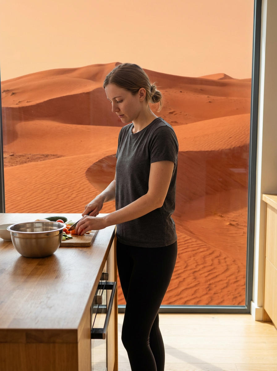 model inside in an indoor kitchen preparing food with Mars red dunes in the big windows. model wears a simple t-shirt and leggings.