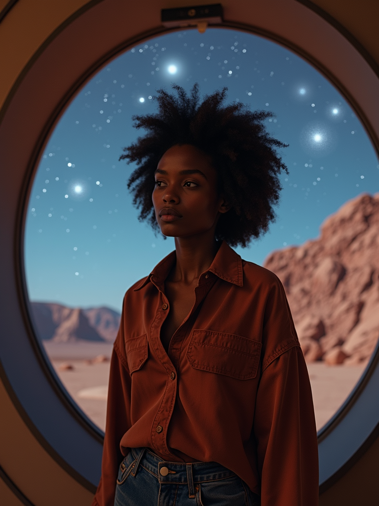 model inside indoor Space Observatory on Mars. only stars visible in ceiling glass at night. model wearing casual clothes.