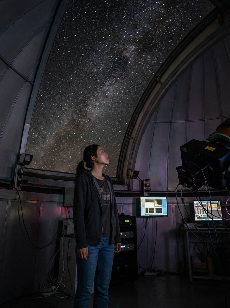 model inside indoor Space Observatory on Mars. only stars visible in ceiling glass at night. model wearing casual clothes.