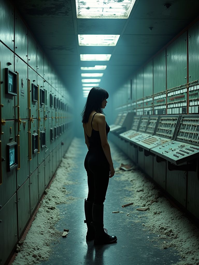 model inside the chernobyl nuclear reactor control room, standing among broken panels, shattered screens switched off. natural light from outside. wearing black boots and black pants and black tank top.