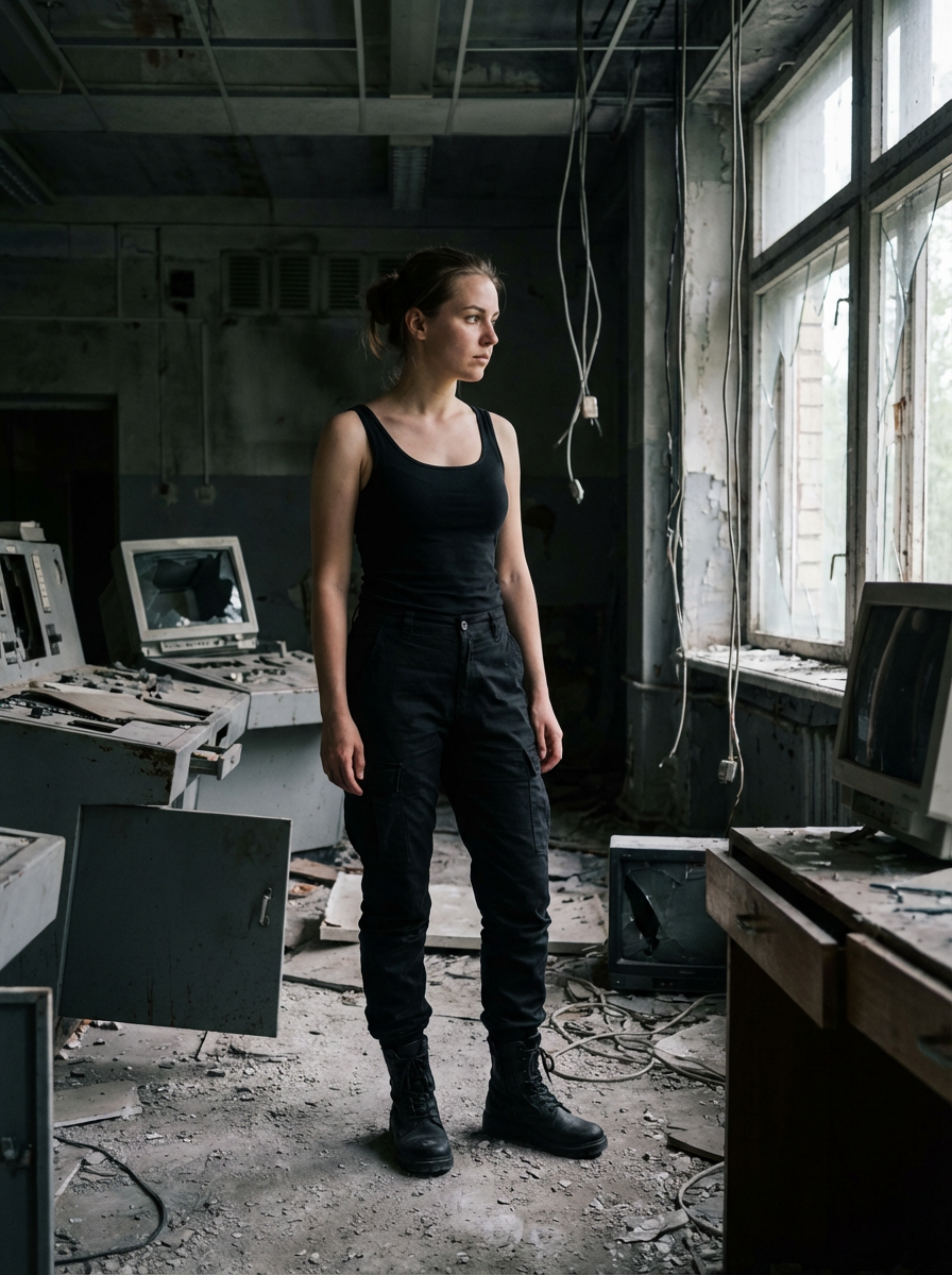 model inside the chernobyl nuclear reactor control room, standing among broken panels, shattered screens switched off. natural light from outside. wearing black boots and black pants and black tank top.