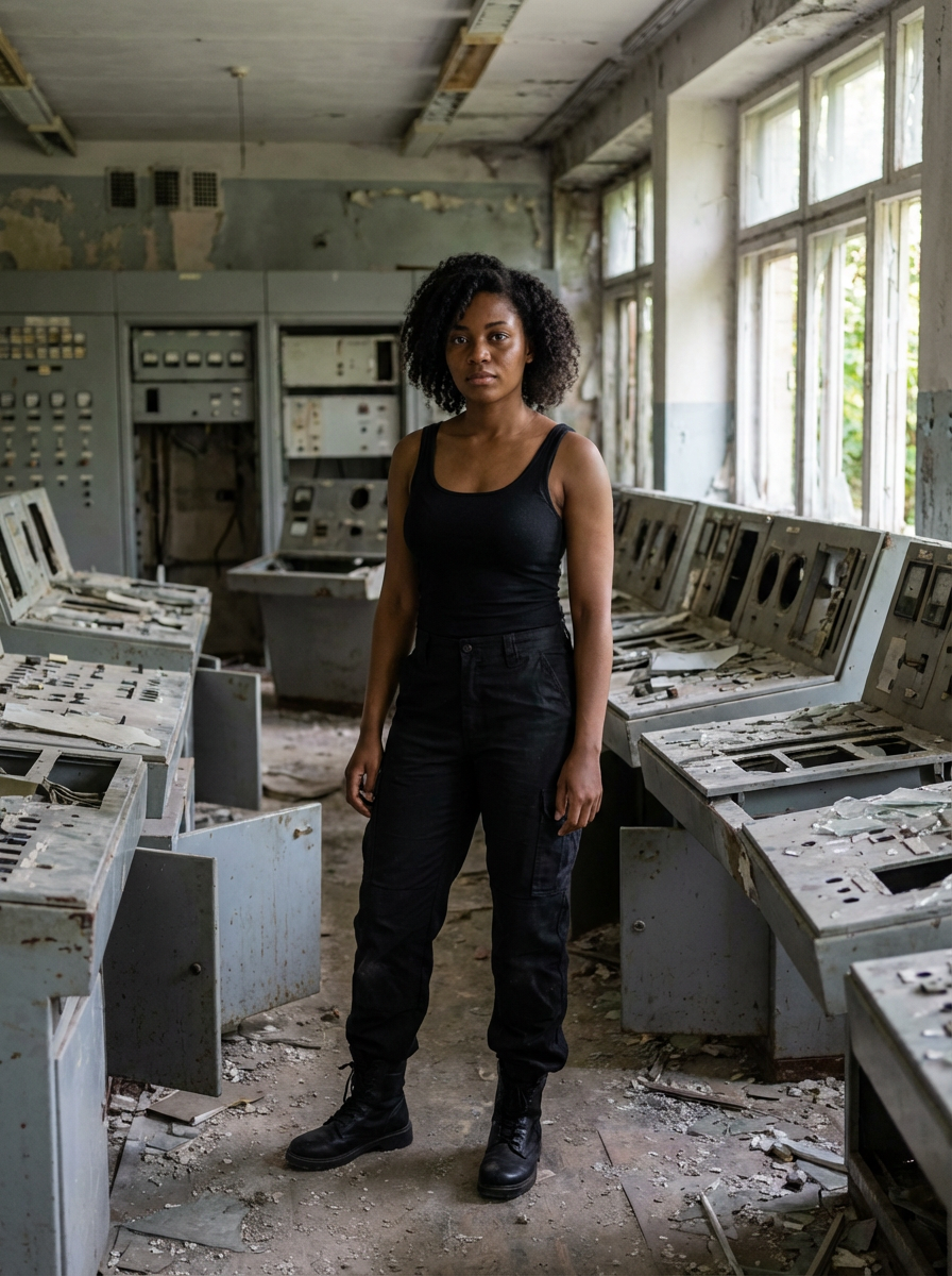 model inside the chernobyl nuclear reactor control room, standing among broken panels, shattered screens switched off. natural light from outside. wearing black boots and black pants and black tank top.