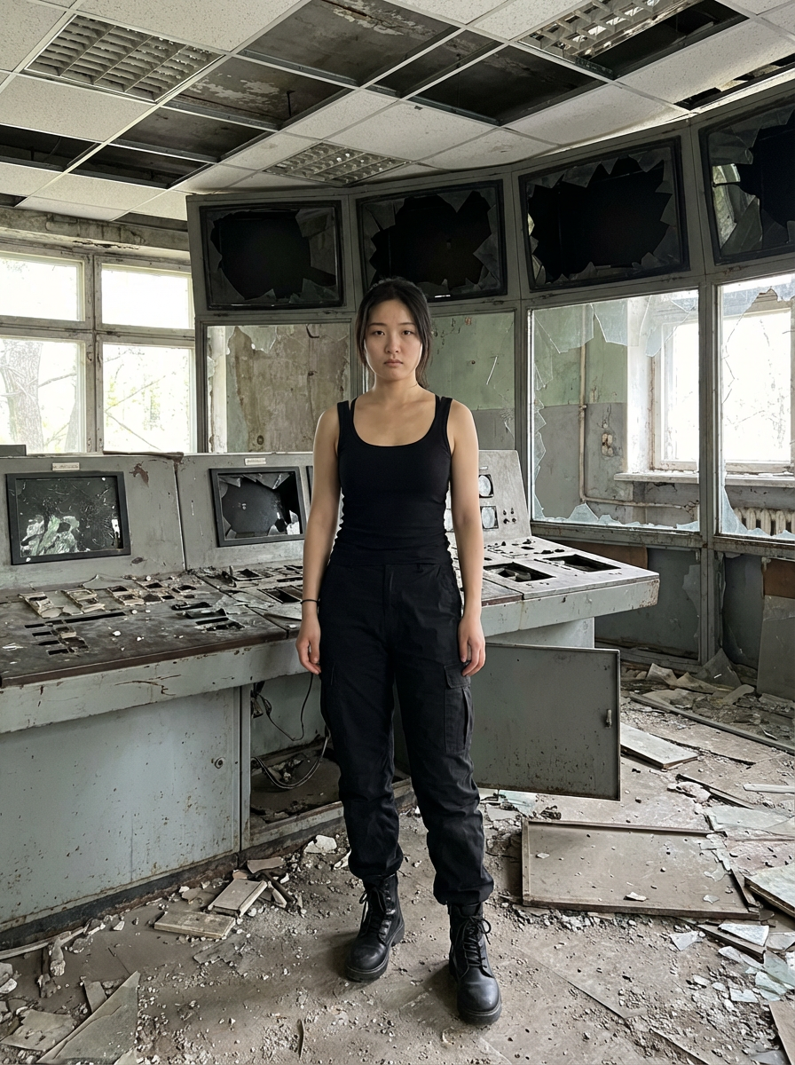 model inside the chernobyl nuclear reactor control room, standing among broken panels, shattered screens switched off. natural light from outside. wearing black boots and black pants and black tank top.