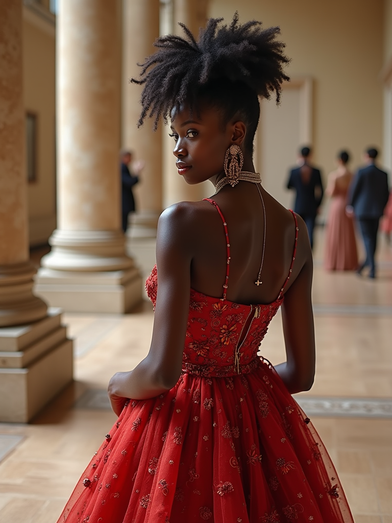model interacting with famous fashion designers in the Met's European sculpture court, wearing a custom-made gown showcasing atelier craftsmanship , museum space transformed with gala decorations