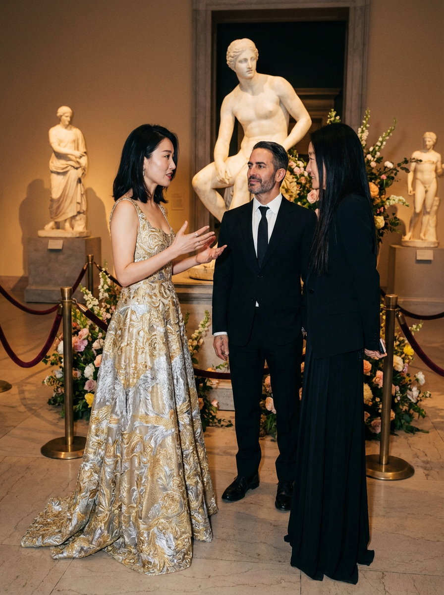 model interacting with famous fashion designers in the Met's European sculpture court, wearing a custom-made gown showcasing atelier craftsmanship , museum space transformed with gala decorations