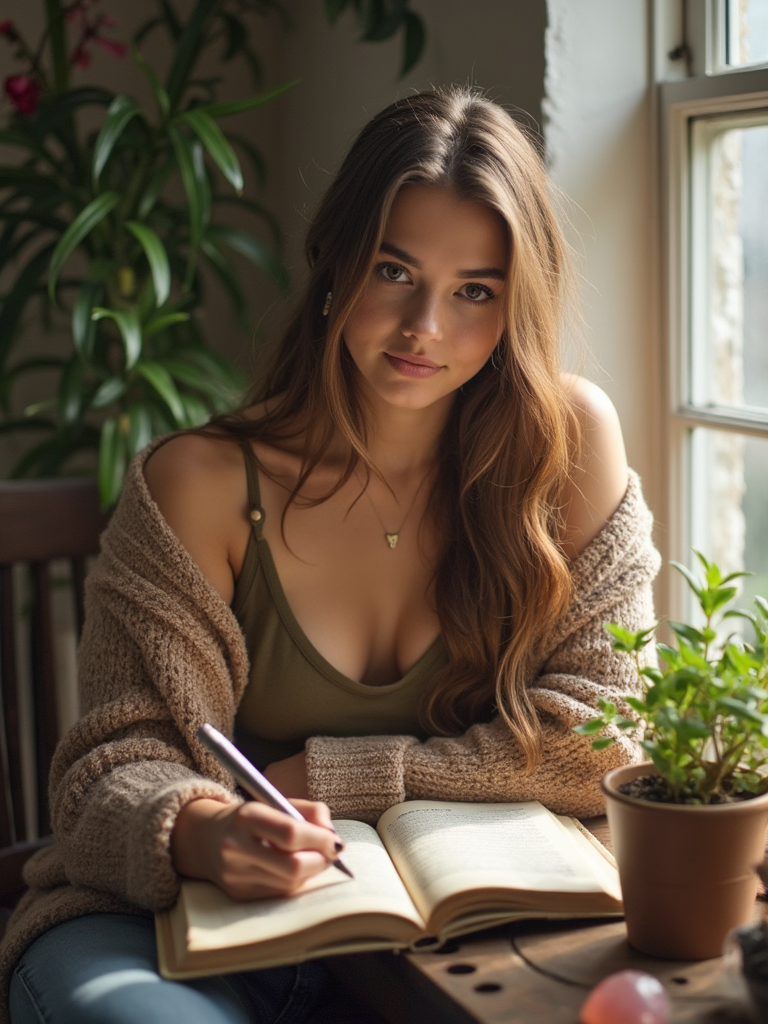 model journaling by window, wearing cozy cardigan over tank top , vintage journal and pen, plants and crystals nearby, warm afternoon light, mindful moment