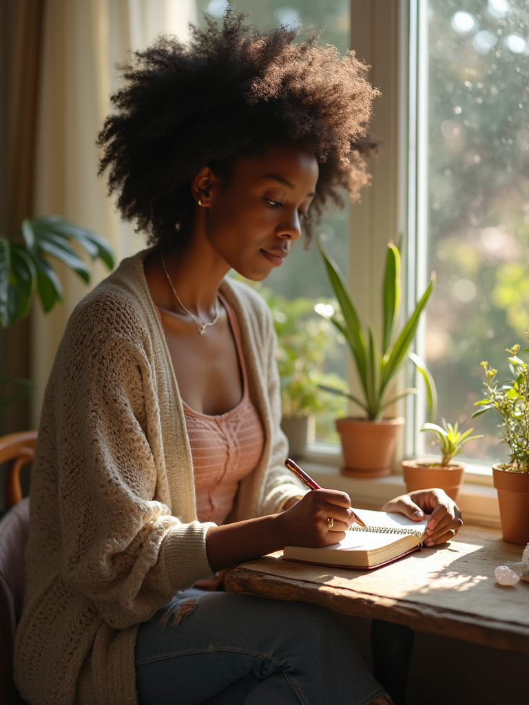 model journaling by window, wearing cozy cardigan over tank top , vintage journal and pen, plants and crystals nearby, warm afternoon light, mindful moment