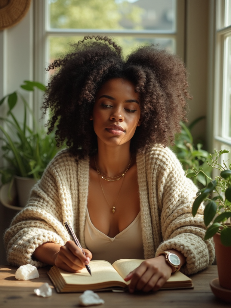 model journaling by window, wearing cozy cardigan over tank top , vintage journal and pen, plants and crystals nearby, warm afternoon light, mindful moment