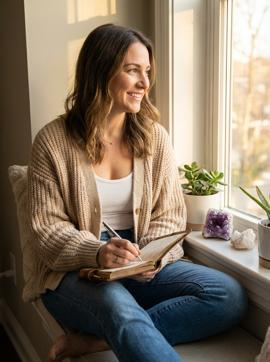 model journaling by window, wearing cozy cardigan over tank top , vintage journal and pen, plants and crystals nearby, warm afternoon light, mindful moment