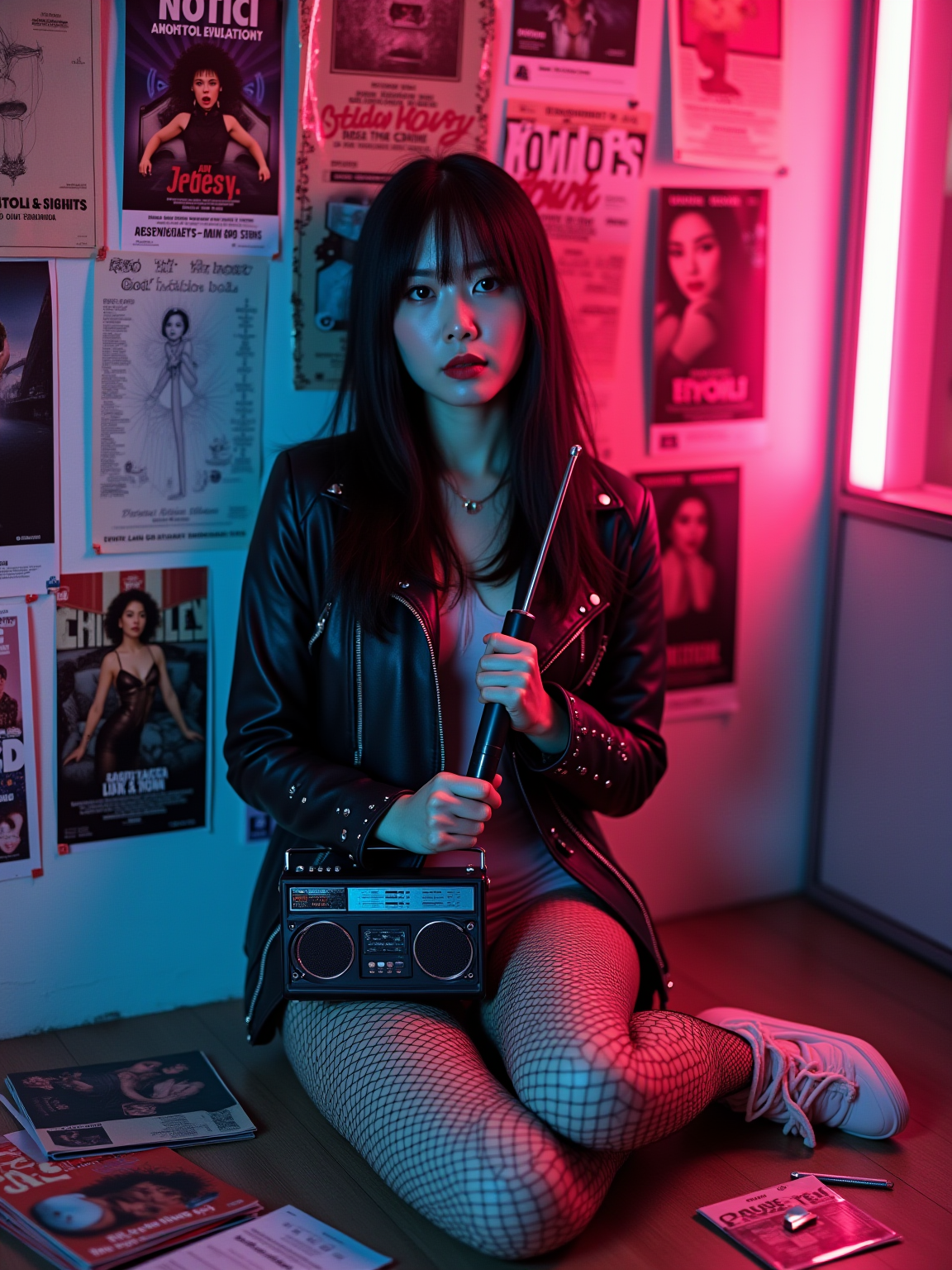 model leaning against a wall covered in 80s movie posters, wearing punk rock outfit with ripped fishnet stockings and studded leather jacket , holding a portable radio with antenna extended, scattered music magazines on the floor, pink and blue neon lighting creating retro atmosphere