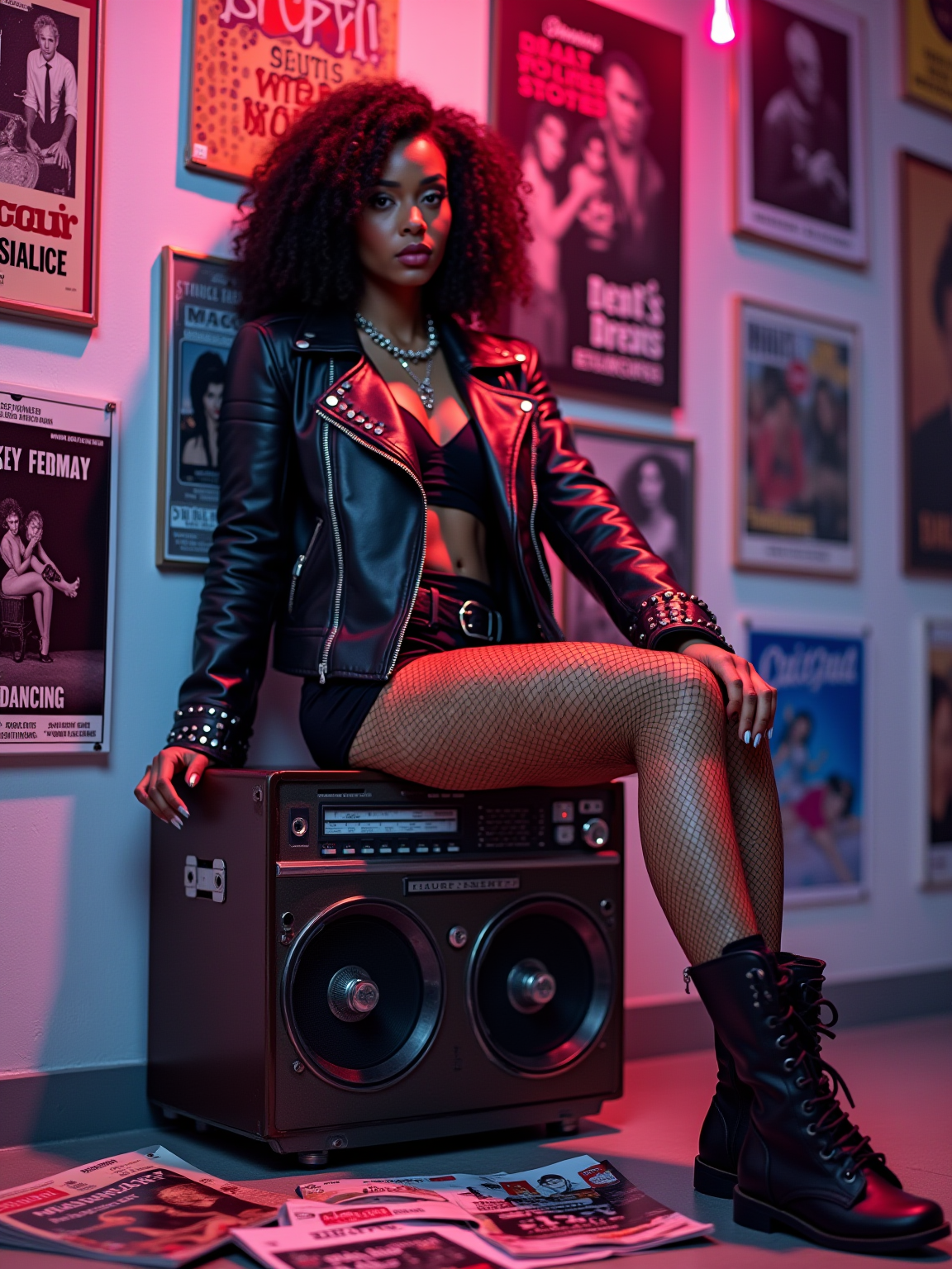 model leaning against a wall covered in 80s movie posters, wearing punk rock outfit with ripped fishnet stockings and studded leather jacket , holding a portable radio with antenna extended, scattered music magazines on the floor, pink and blue neon lighting creating retro atmosphere