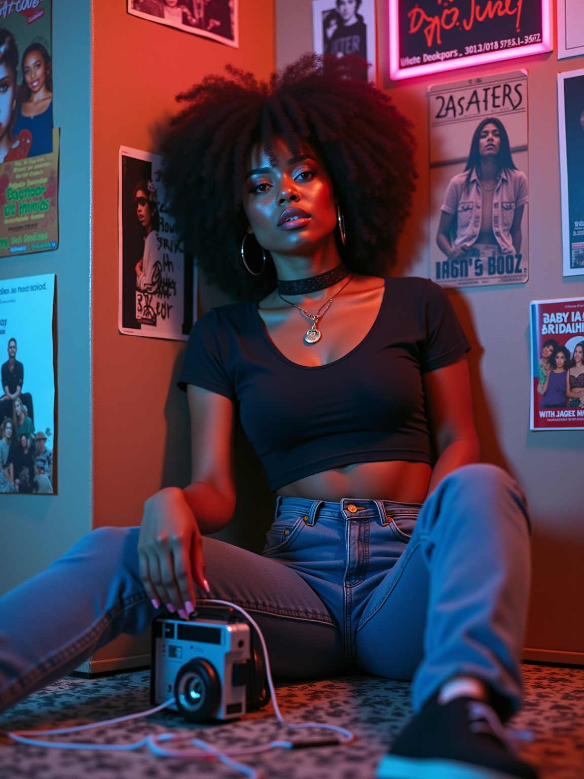 model leaning against a wall covered in 90s band posters, wearing a choker necklace, baby tee, and low-rise jeans , holding a Walkman with tangled headphone wires, scattered music magazines on the floor, neon lighting creating a nostalgic glow