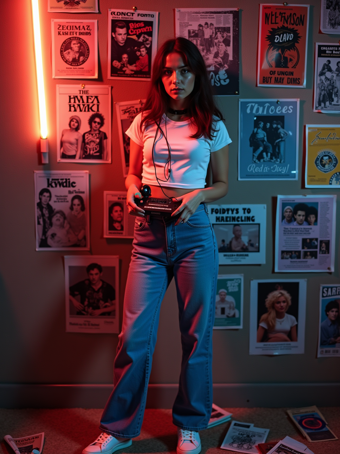 model leaning against a wall covered in 90s band posters, wearing a choker necklace, baby tee, and low-rise jeans , holding a Walkman with tangled headphone wires, scattered music magazines on the floor, neon lighting creating a nostalgic glow