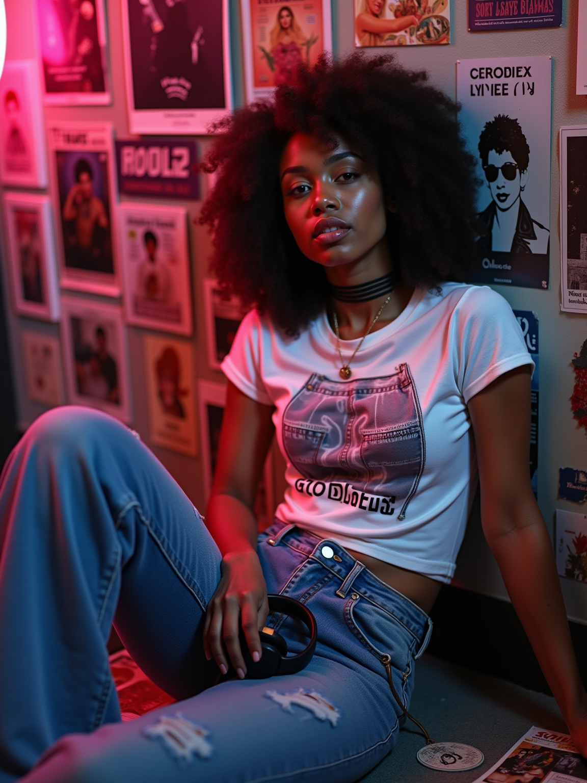 model leaning against a wall covered in 90s band posters, wearing a choker necklace, baby tee, and low-rise jeans , holding a Walkman with tangled headphone wires, scattered music magazines on the floor, neon lighting creating a nostalgic glow