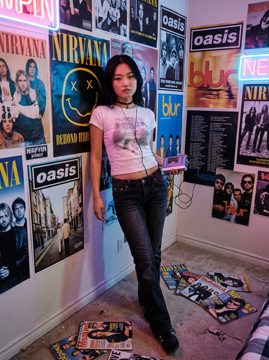 model leaning against a wall covered in 90s band posters, wearing a choker necklace, baby tee, and low-rise jeans , holding a Walkman with tangled headphone wires, scattered music magazines on the floor, neon lighting creating a nostalgic glow