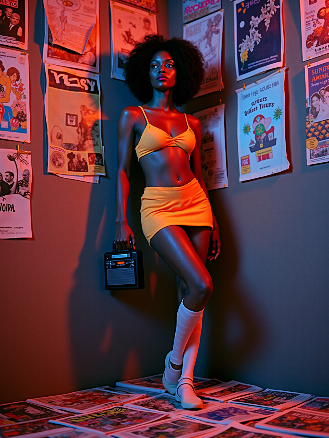 model leaning against a wall covered in concert posters and album artwork, wearing a mod mini skirt with striped tights and ballet flats , holding a portable AM radio, scattered 16 Magazine and Tiger Beat publications on the floor, blacklight posters glowing under colored bulbs