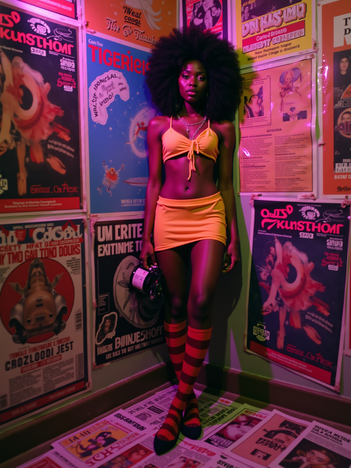 model leaning against a wall covered in concert posters and album artwork, wearing a mod mini skirt with striped tights and ballet flats , holding a portable AM radio, scattered 16 Magazine and Tiger Beat publications on the floor, blacklight posters glowing under colored bulbs