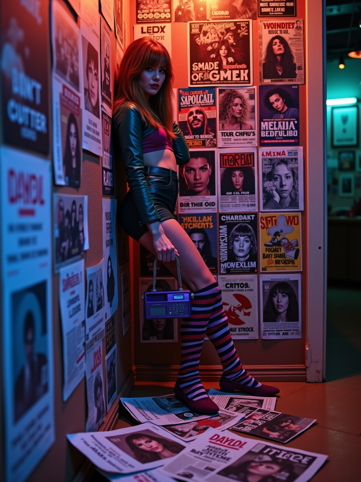 model leaning against a wall covered in concert posters and album artwork, wearing a mod mini skirt with striped tights and ballet flats , holding a portable AM radio, scattered 16 Magazine and Tiger Beat publications on the floor, blacklight posters glowing under colored bulbs