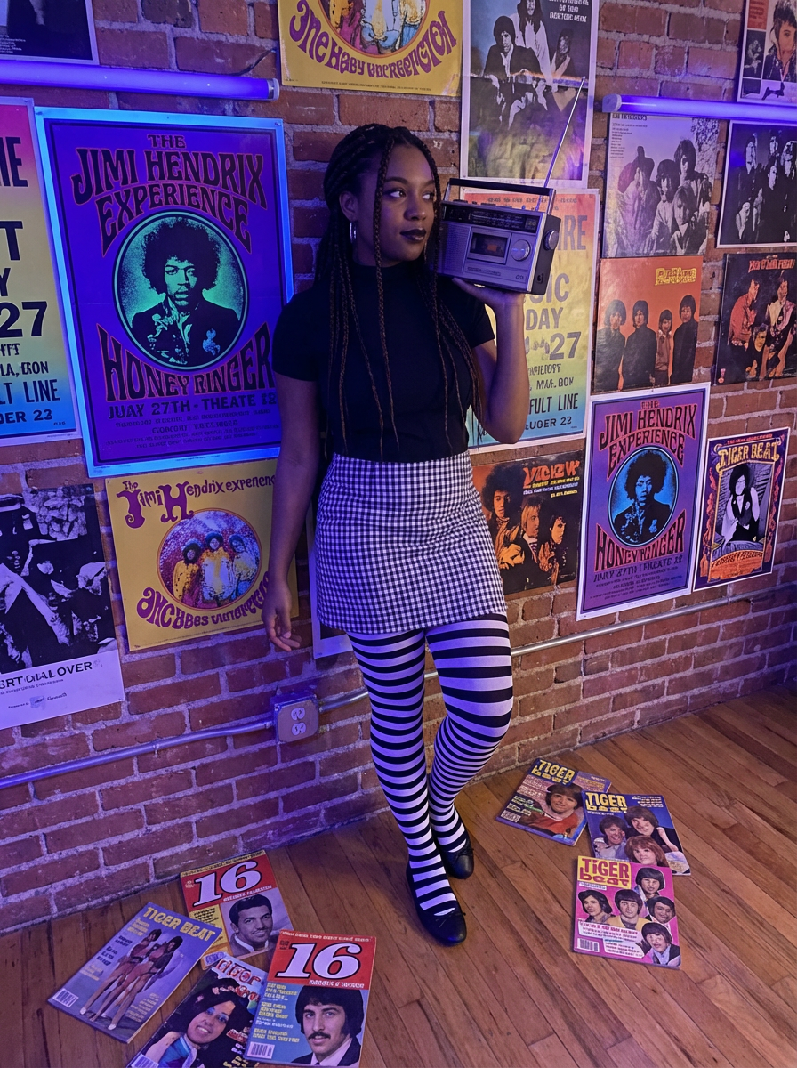 model leaning against a wall covered in concert posters and album artwork, wearing a mod mini skirt with striped tights and ballet flats , holding a portable AM radio, scattered 16 Magazine and Tiger Beat publications on the floor, blacklight posters glowing under colored bulbs