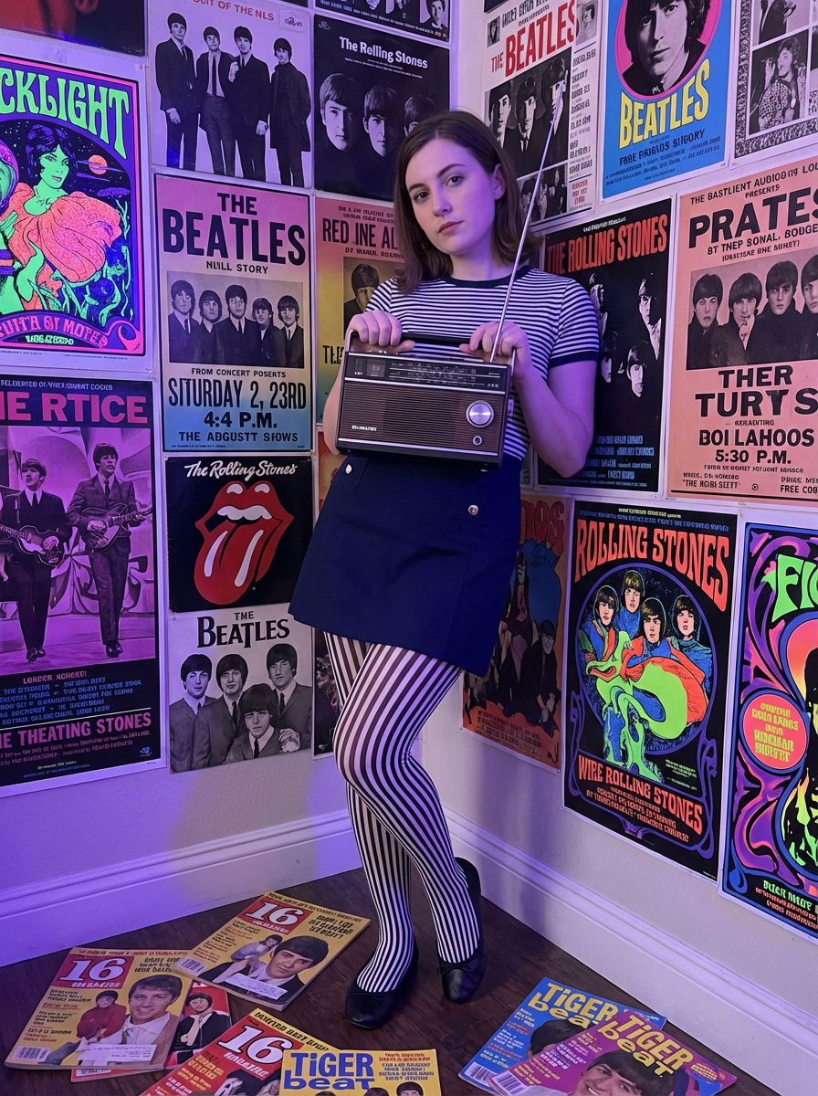 model leaning against a wall covered in concert posters and album artwork, wearing a mod mini skirt with striped tights and ballet flats , holding a portable AM radio, scattered 16 Magazine and Tiger Beat publications on the floor, blacklight posters glowing under colored bulbs