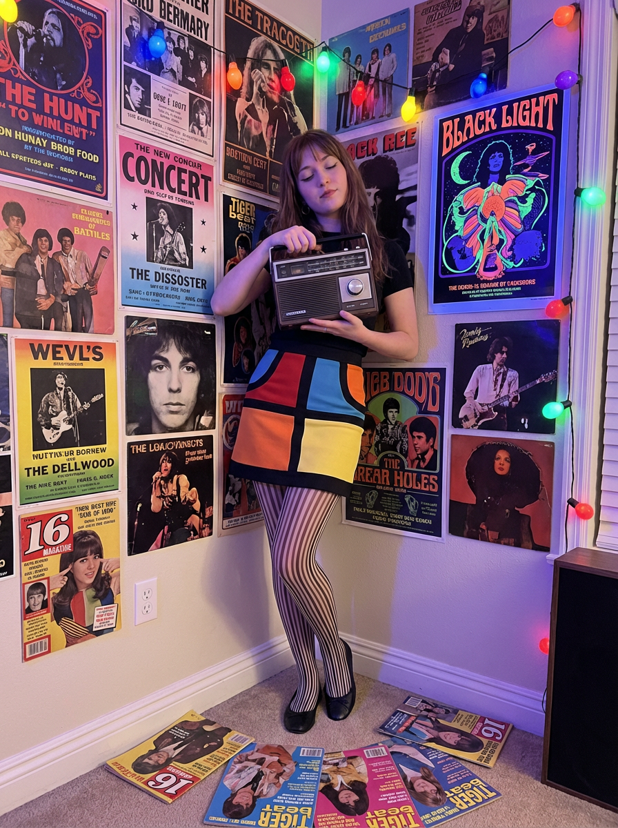 model leaning against a wall covered in concert posters and album artwork, wearing a mod mini skirt with striped tights and ballet flats , holding a portable AM radio, scattered 16 Magazine and Tiger Beat publications on the floor, blacklight posters glowing under colored bulbs