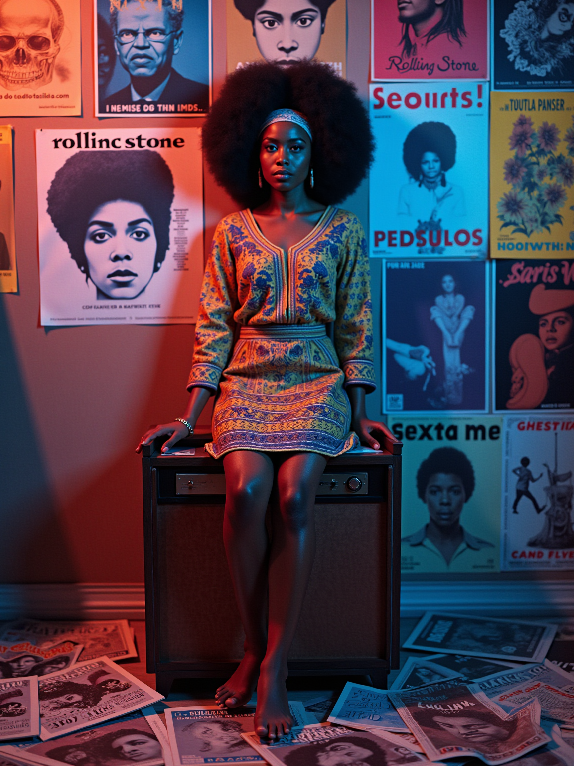 model leaning against a wall covered in concert posters and album covers, wearing a peasant skirt with embroidered blouse and headband , holding a transistor radio with telescoping antenna, scattered Rolling Stone magazines on the floor, psychedelic blacklight posters glowing under colored lighting