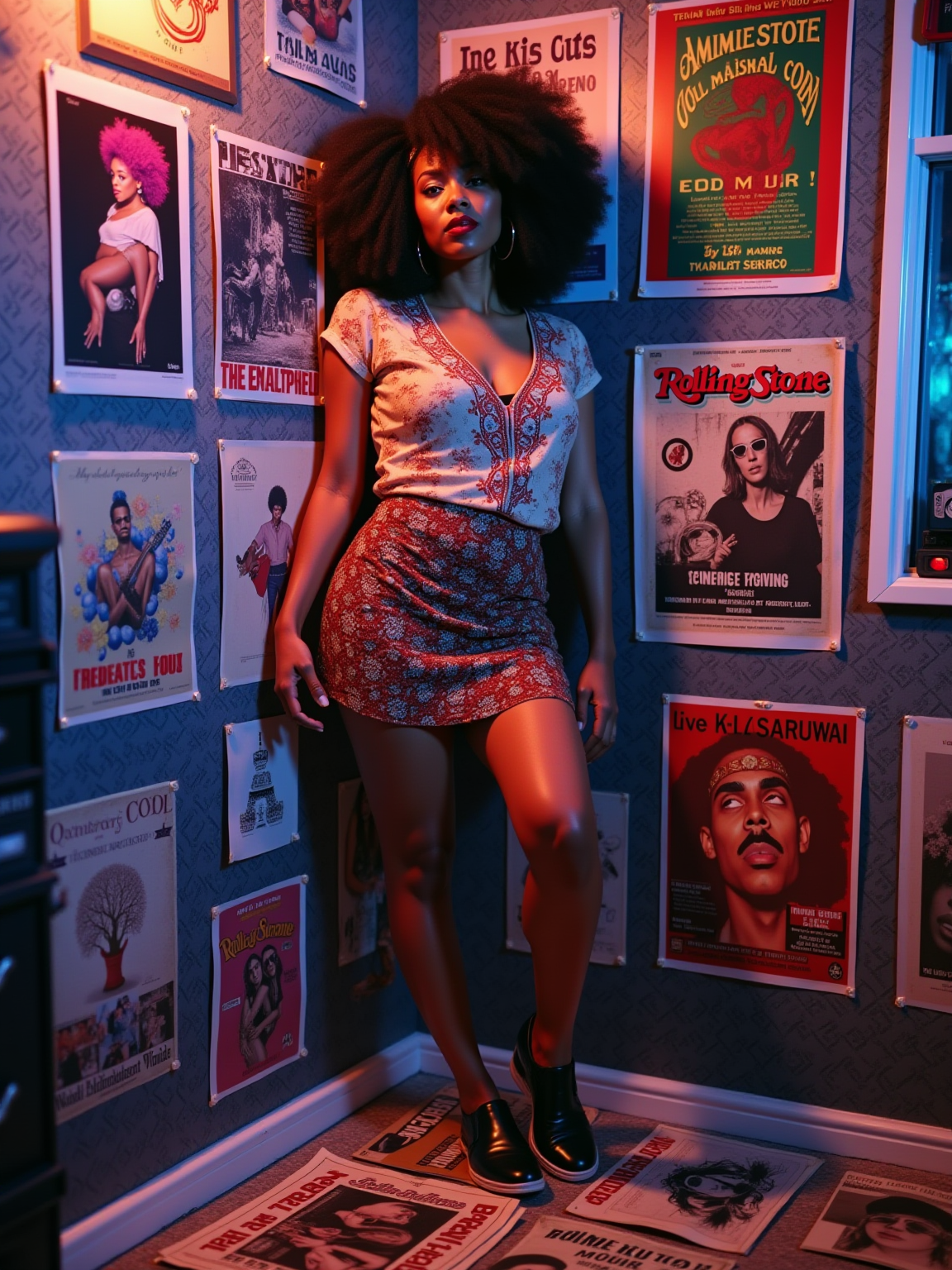 model leaning against a wall covered in concert posters and album covers, wearing a peasant skirt with embroidered blouse and headband , holding a transistor radio with telescoping antenna, scattered Rolling Stone magazines on the floor, psychedelic blacklight posters glowing under colored lighting