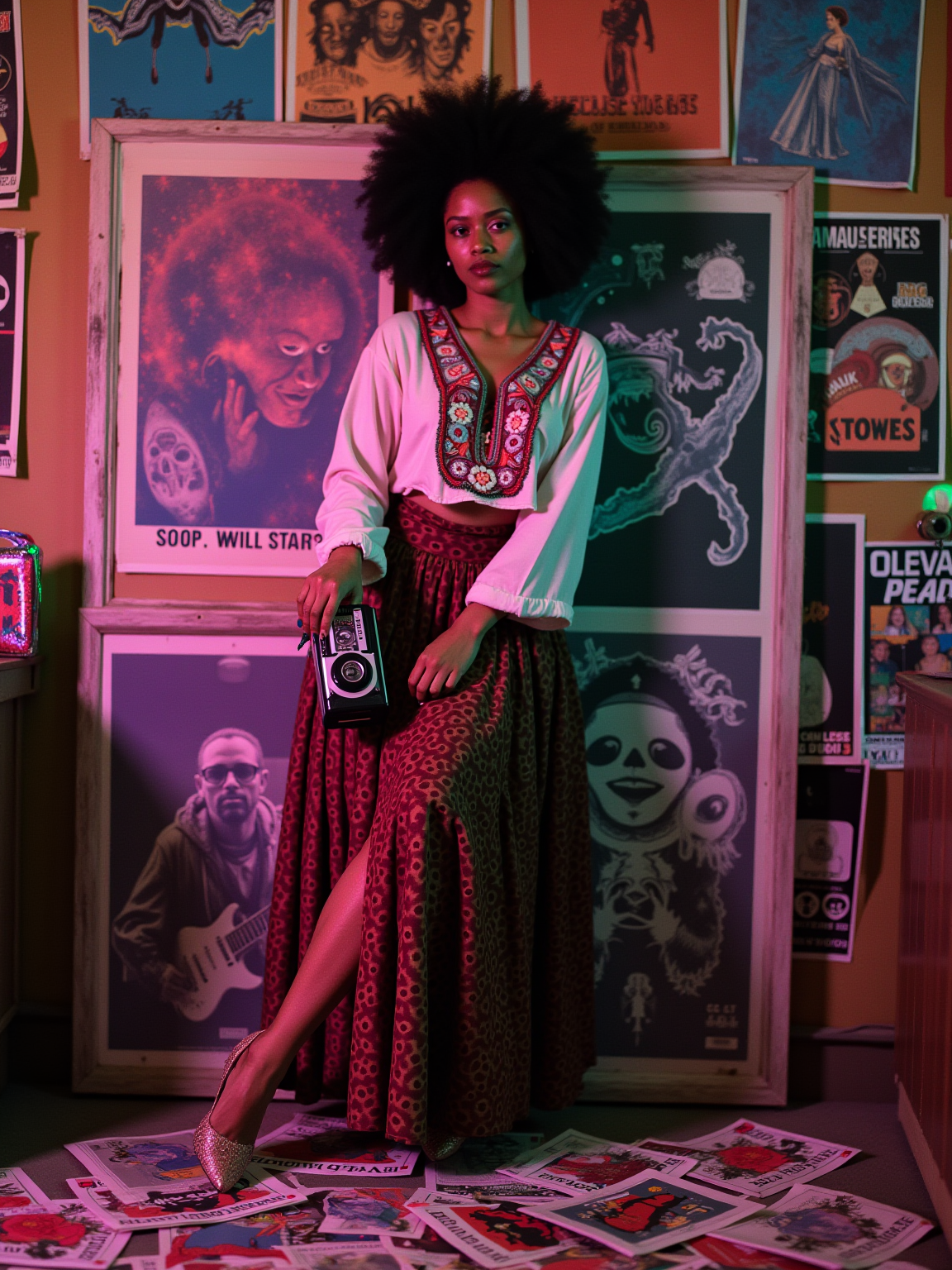 model leaning against a wall covered in concert posters and album covers, wearing a peasant skirt with embroidered blouse and headband , holding a transistor radio with telescoping antenna, scattered Rolling Stone magazines on the floor, psychedelic blacklight posters glowing under colored lighting