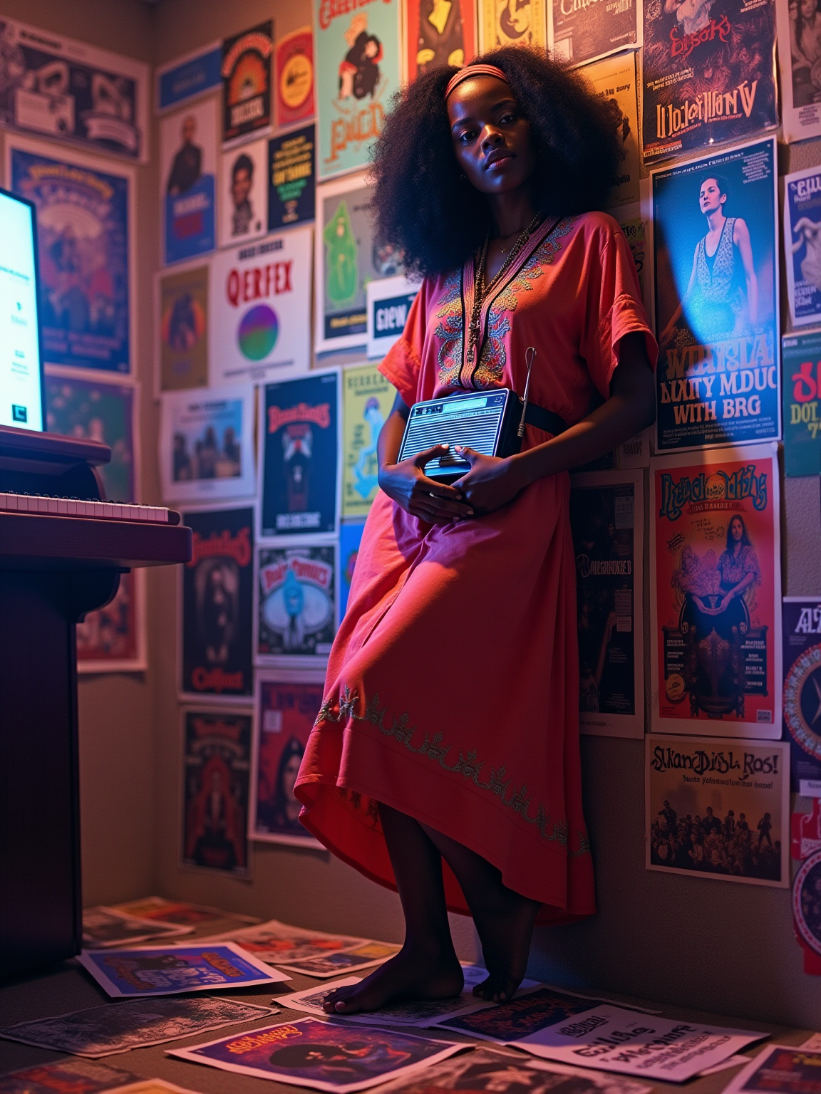 model leaning against a wall covered in concert posters and album covers, wearing a peasant skirt with embroidered blouse and headband , holding a transistor radio with telescoping antenna, scattered Rolling Stone magazines on the floor, psychedelic blacklight posters glowing under colored lighting