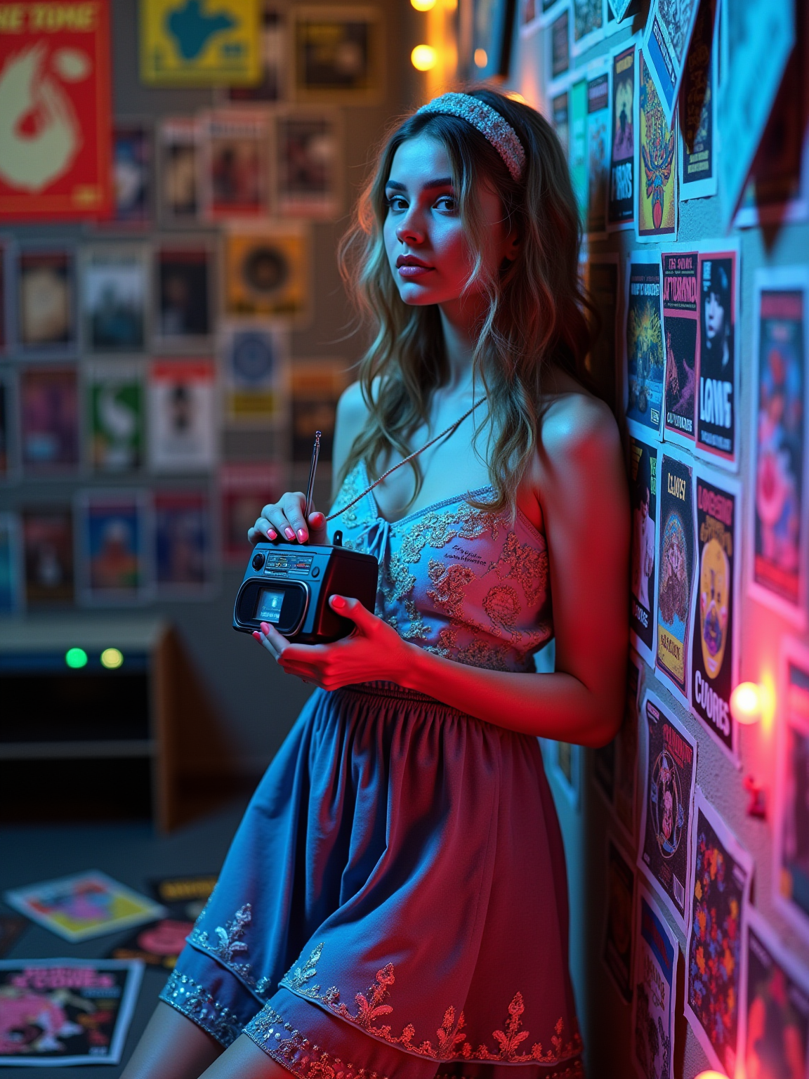 model leaning against a wall covered in concert posters and album covers, wearing a peasant skirt with embroidered blouse and headband , holding a transistor radio with telescoping antenna, scattered Rolling Stone magazines on the floor, psychedelic blacklight posters glowing under colored lighting