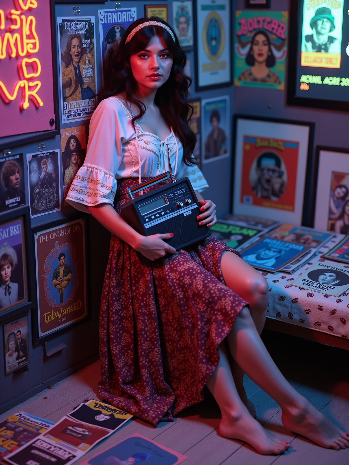 model leaning against a wall covered in concert posters and album covers, wearing a peasant skirt with embroidered blouse and headband , holding a transistor radio with telescoping antenna, scattered Rolling Stone magazines on the floor, psychedelic blacklight posters glowing under colored lighting