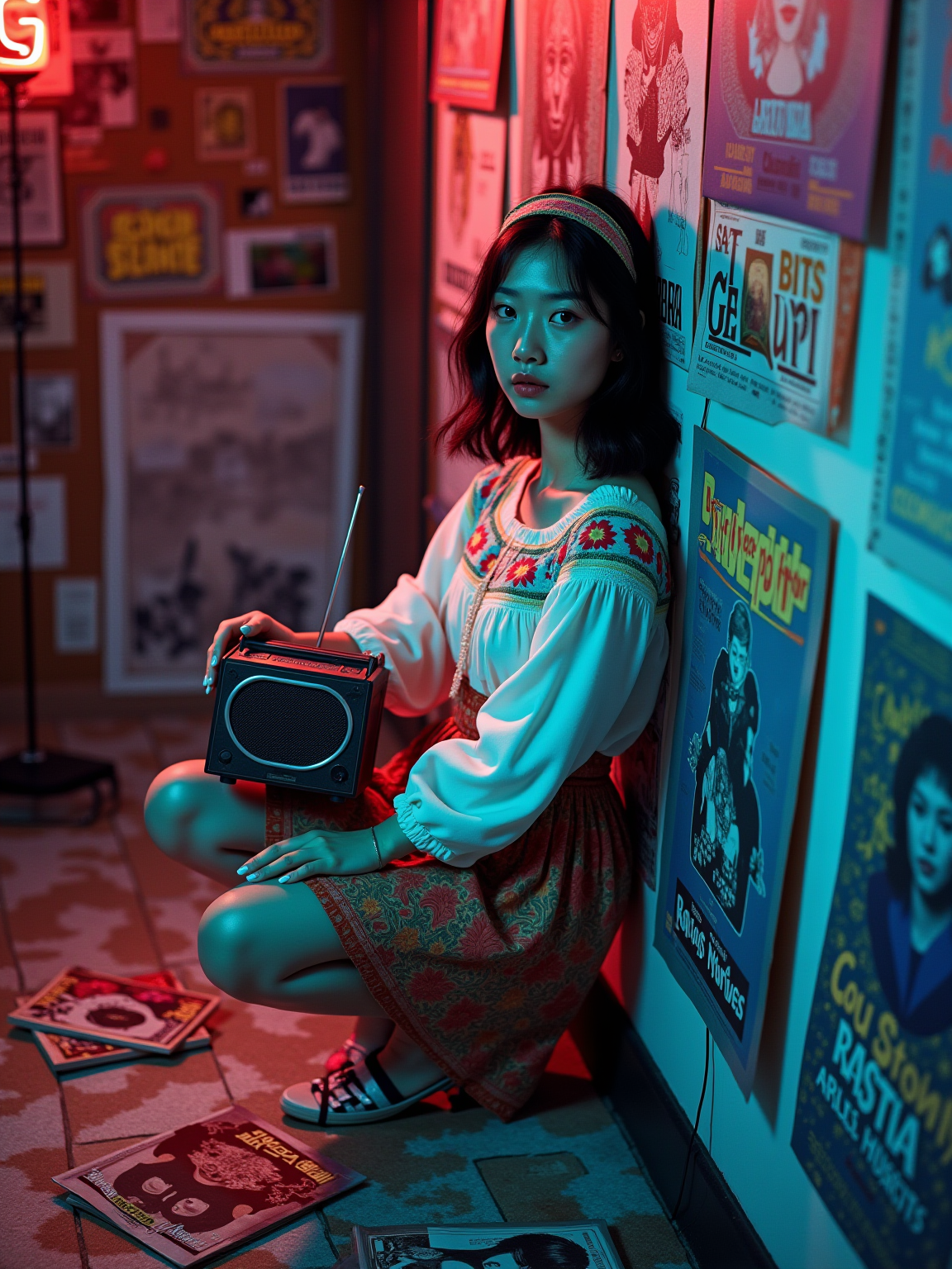 model leaning against a wall covered in concert posters and album covers, wearing a peasant skirt with embroidered blouse and headband , holding a transistor radio with telescoping antenna, scattered Rolling Stone magazines on the floor, psychedelic blacklight posters glowing under colored lighting