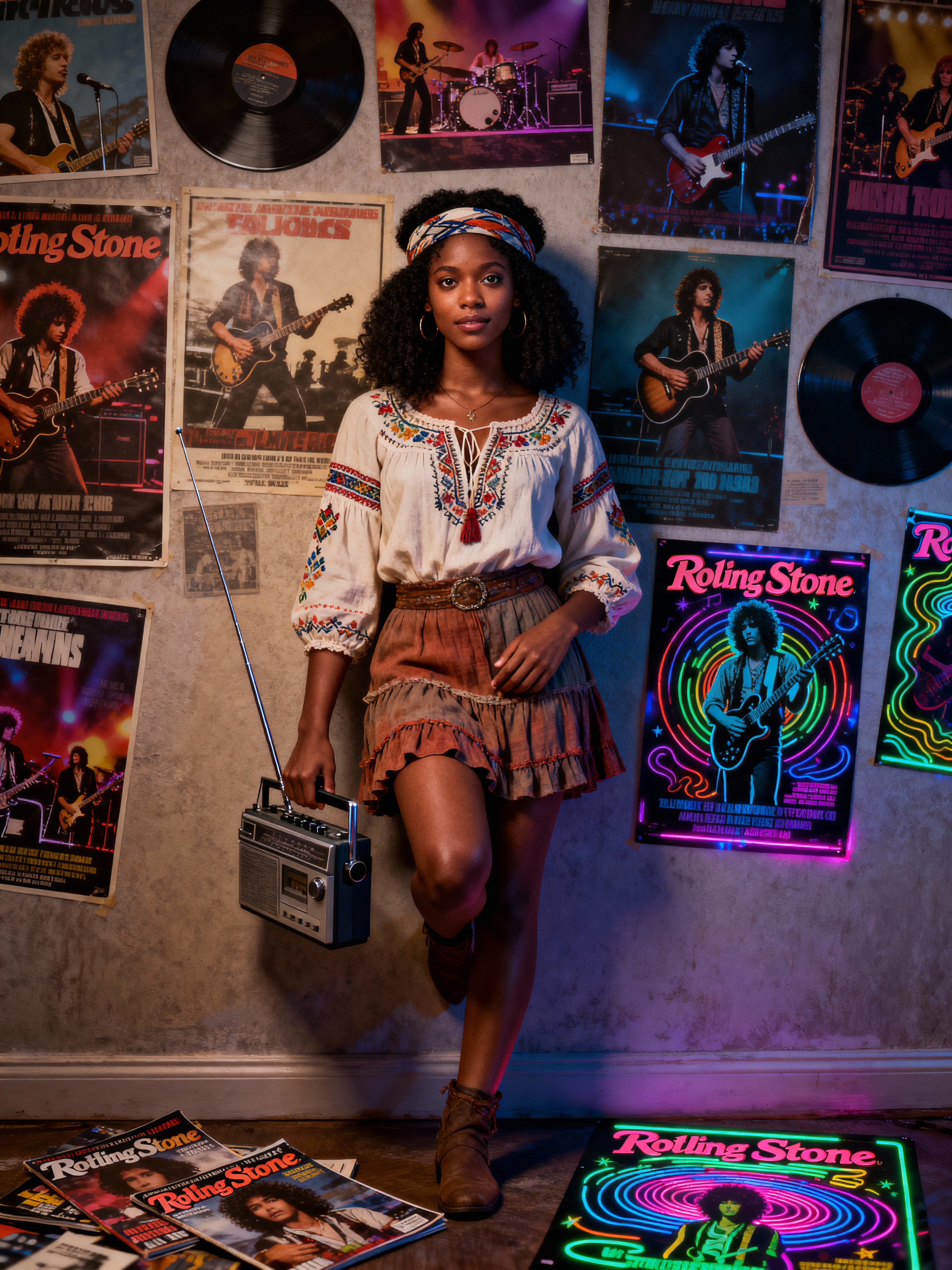 model leaning against a wall covered in concert posters and album covers, wearing a peasant skirt with embroidered blouse and headband , holding a transistor radio with telescoping antenna, scattered Rolling Stone magazines on the floor, psychedelic blacklight posters glowing under colored lighting