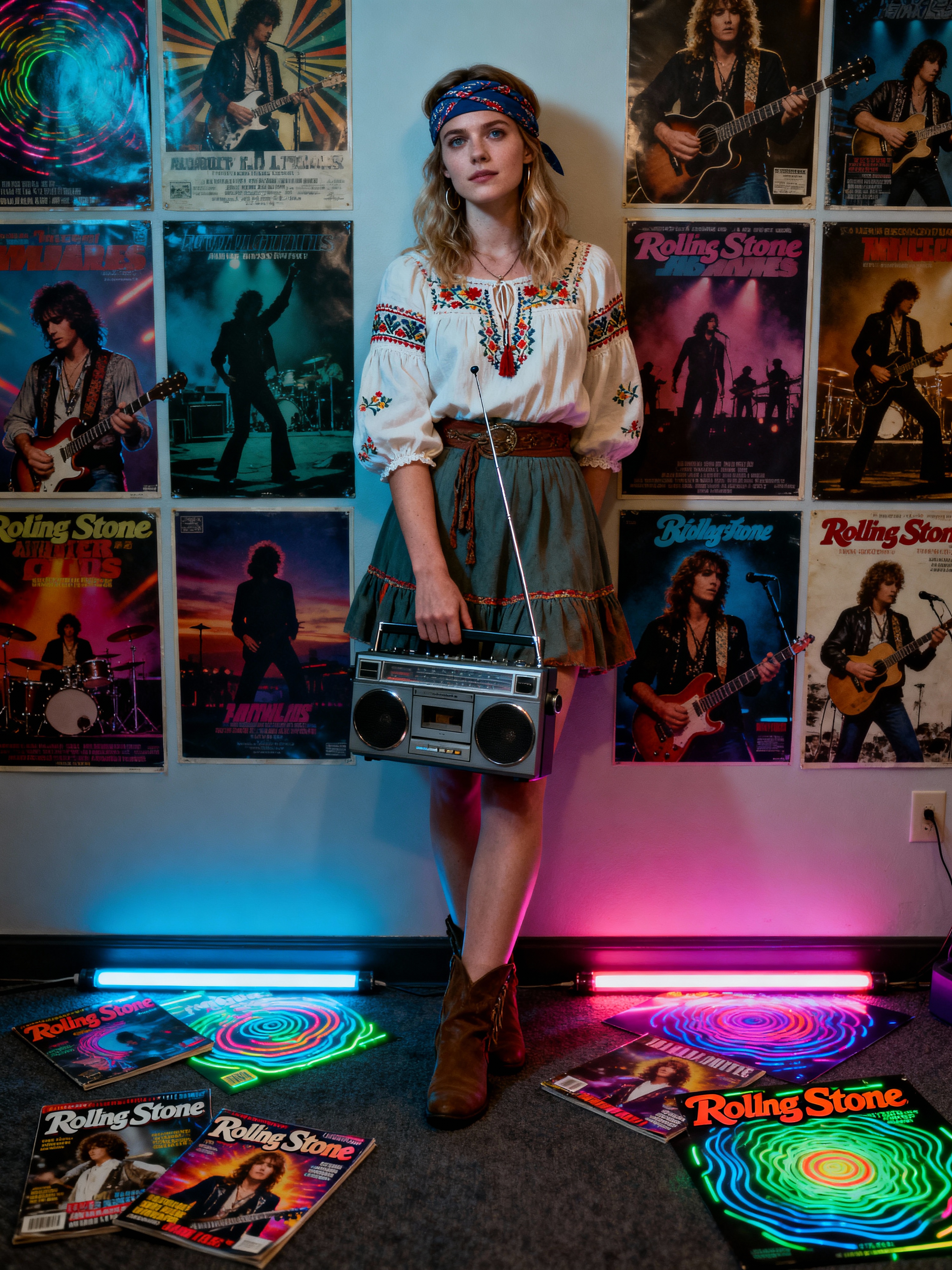 model leaning against a wall covered in concert posters and album covers, wearing a peasant skirt with embroidered blouse and headband , holding a transistor radio with telescoping antenna, scattered Rolling Stone magazines on the floor, psychedelic blacklight posters glowing under colored lighting