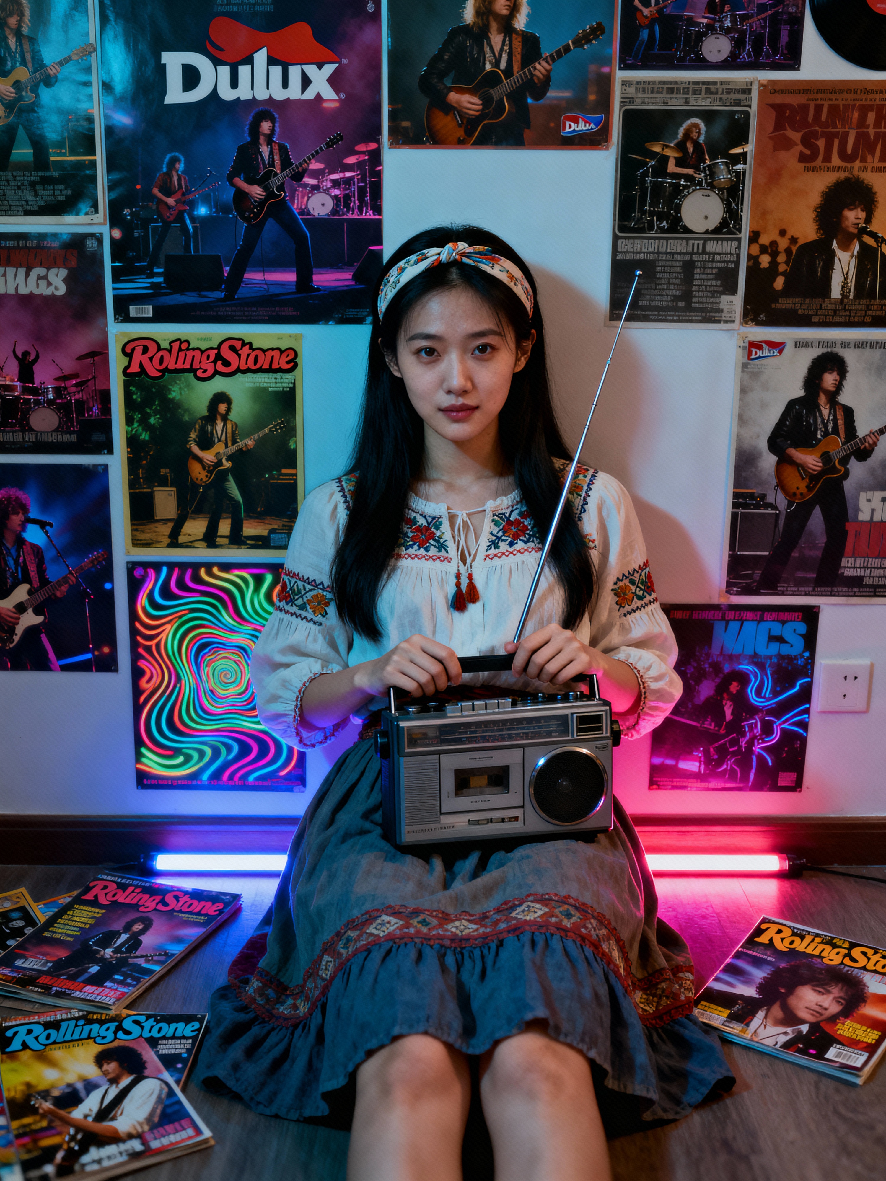 model leaning against a wall covered in concert posters and album covers, wearing a peasant skirt with embroidered blouse and headband , holding a transistor radio with telescoping antenna, scattered Rolling Stone magazines on the floor, psychedelic blacklight posters glowing under colored lighting