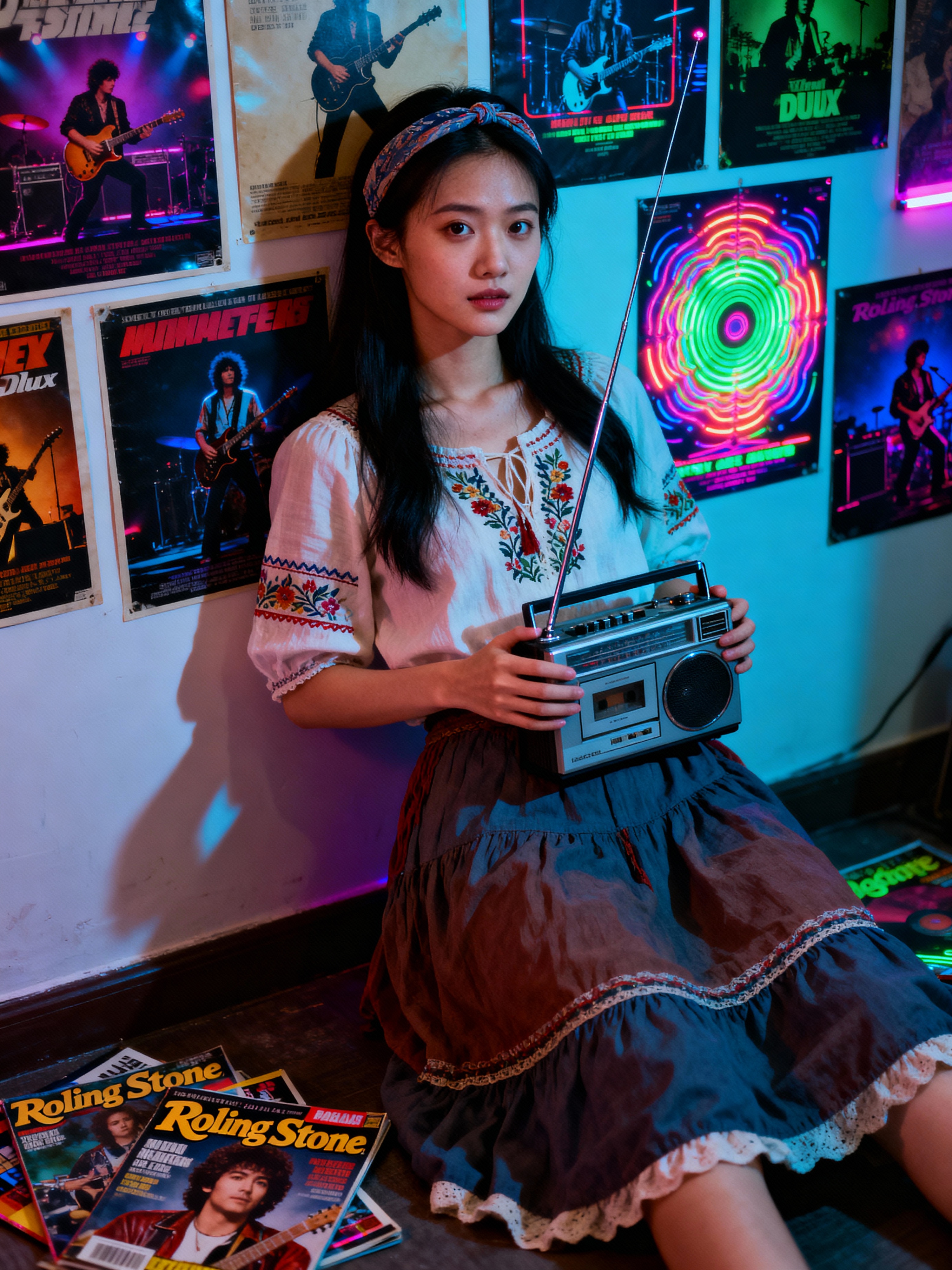 model leaning against a wall covered in concert posters and album covers, wearing a peasant skirt with embroidered blouse and headband , holding a transistor radio with telescoping antenna, scattered Rolling Stone magazines on the floor, psychedelic blacklight posters glowing under colored lighting