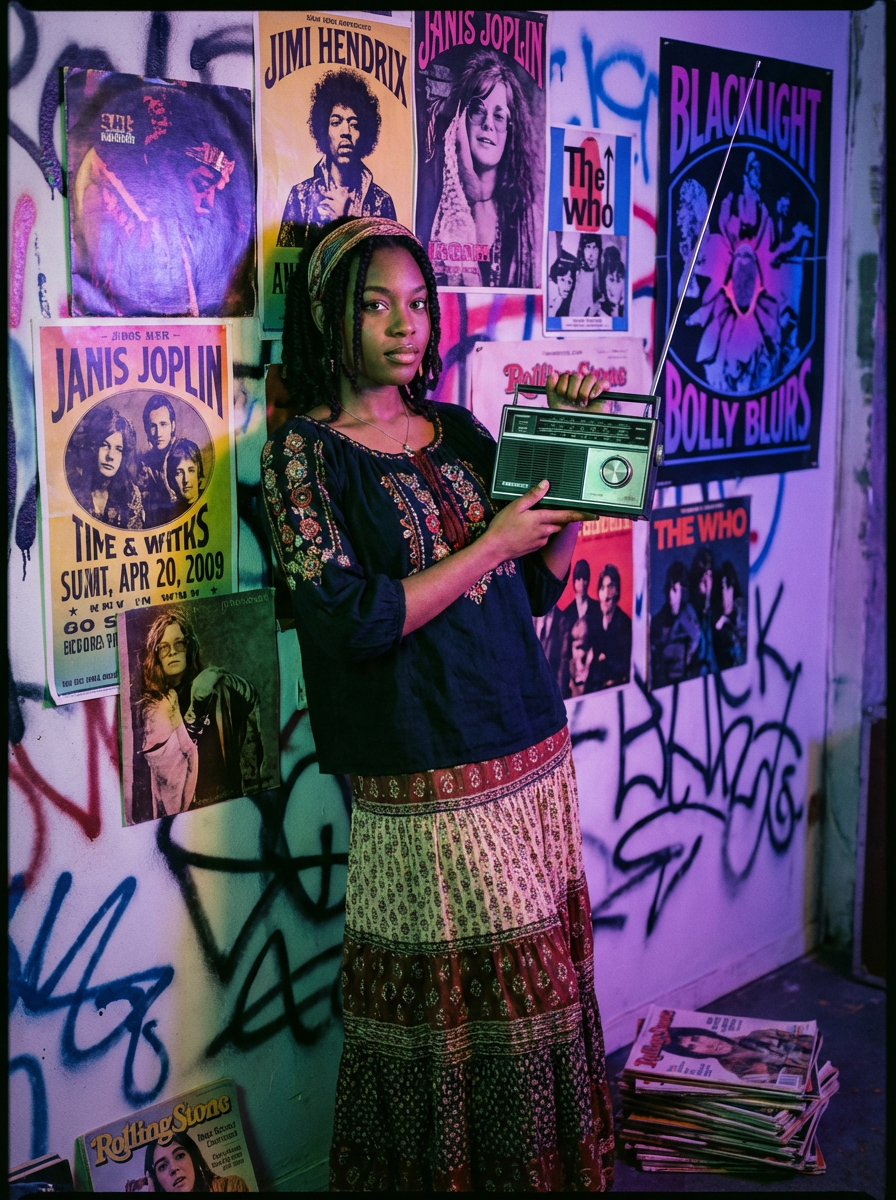 model leaning against a wall covered in concert posters and album covers, wearing a peasant skirt with embroidered blouse and headband , holding a transistor radio with telescoping antenna, scattered Rolling Stone magazines on the floor, psychedelic blacklight posters glowing under colored lighting