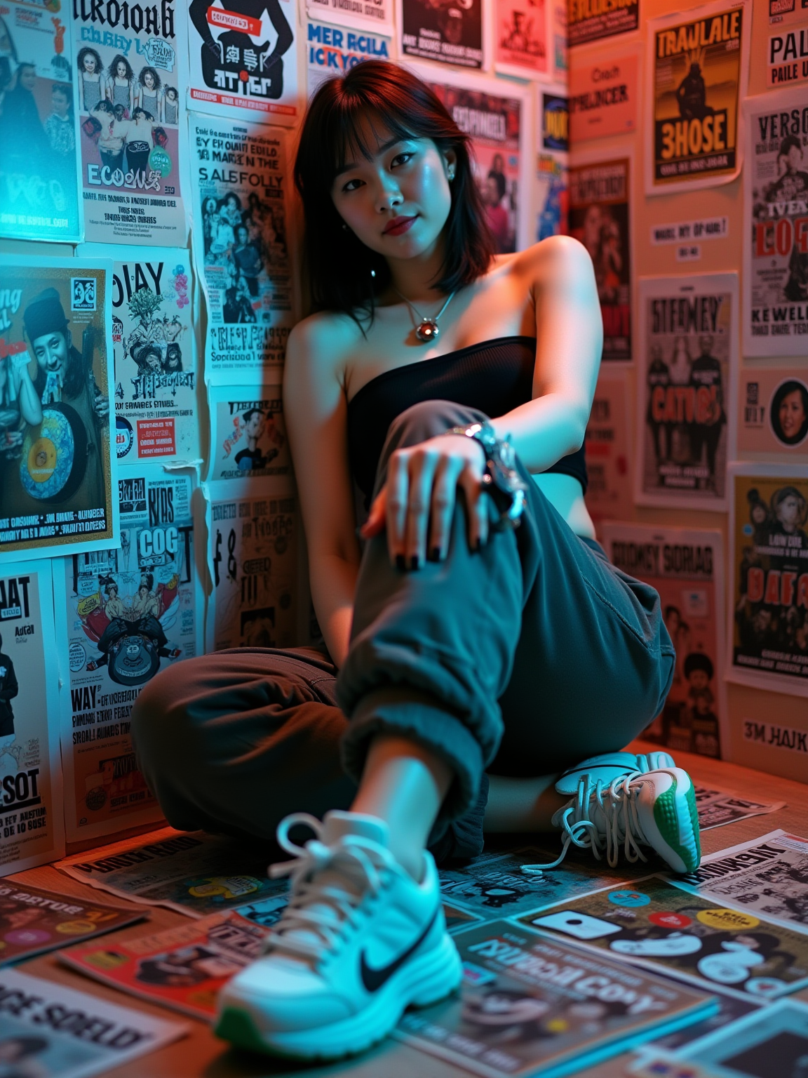 model leaning against a wall covered in teen magazine cutouts and CD inserts, wearing a tube top with cargo pants and chunky sneakers , holding a Walkman with tangled earbuds, scattered Tiger Beat and J-14 magazines on the floor, blacklight posters of Nu Metal bands