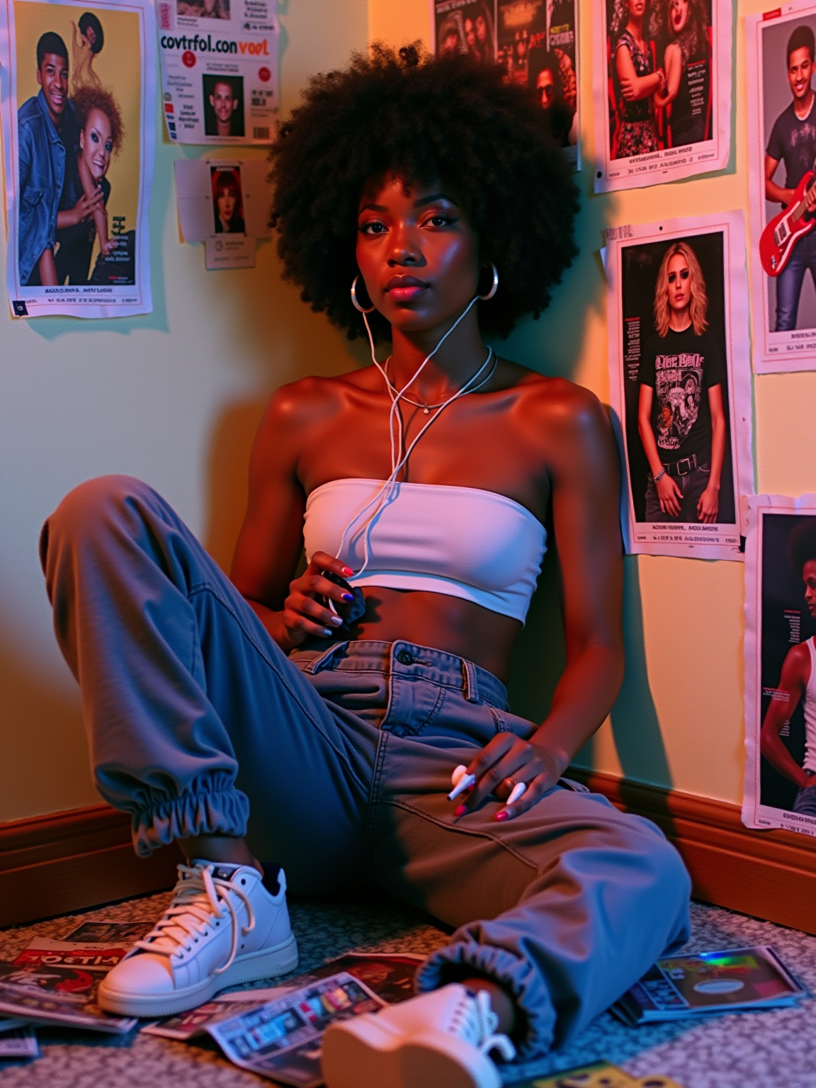 model leaning against a wall covered in teen magazine cutouts and CD inserts, wearing a tube top with cargo pants and chunky sneakers , holding a Walkman with tangled earbuds, scattered Tiger Beat and J-14 magazines on the floor, blacklight posters of Nu Metal bands
