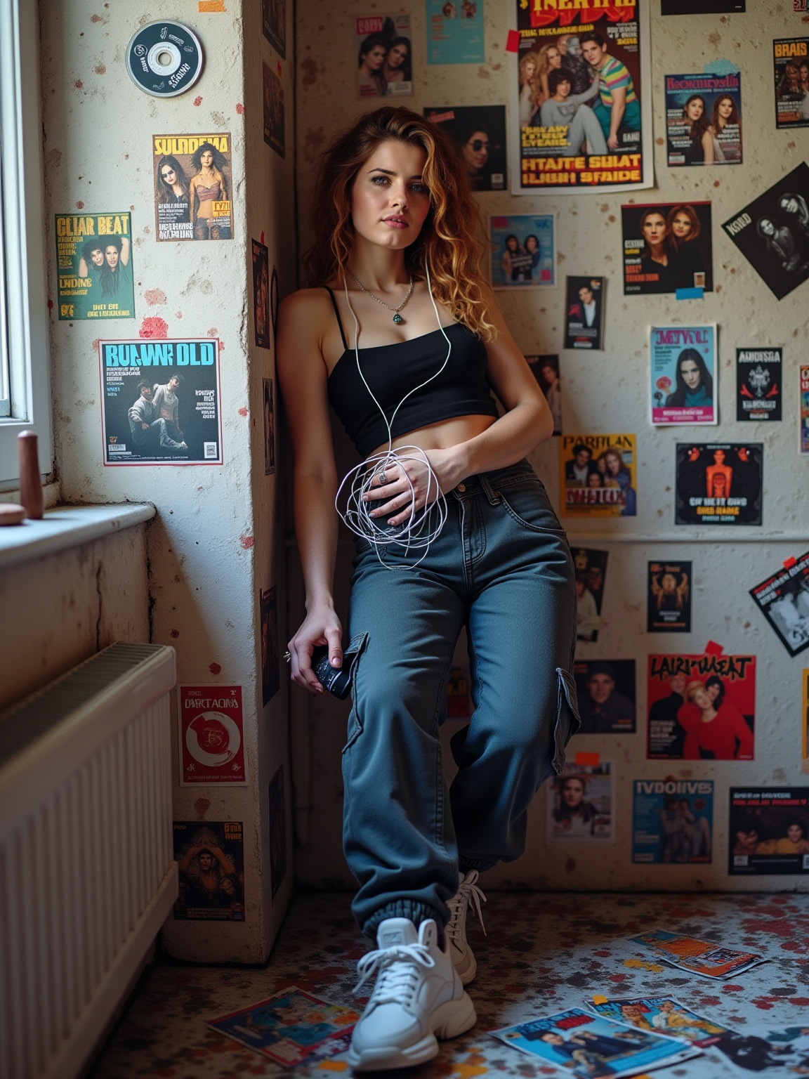 model leaning against a wall covered in teen magazine cutouts and CD inserts, wearing a tube top with cargo pants and chunky sneakers , holding a Walkman with tangled earbuds, scattered Tiger Beat and J-14 magazines on the floor, blacklight posters of Nu Metal bands