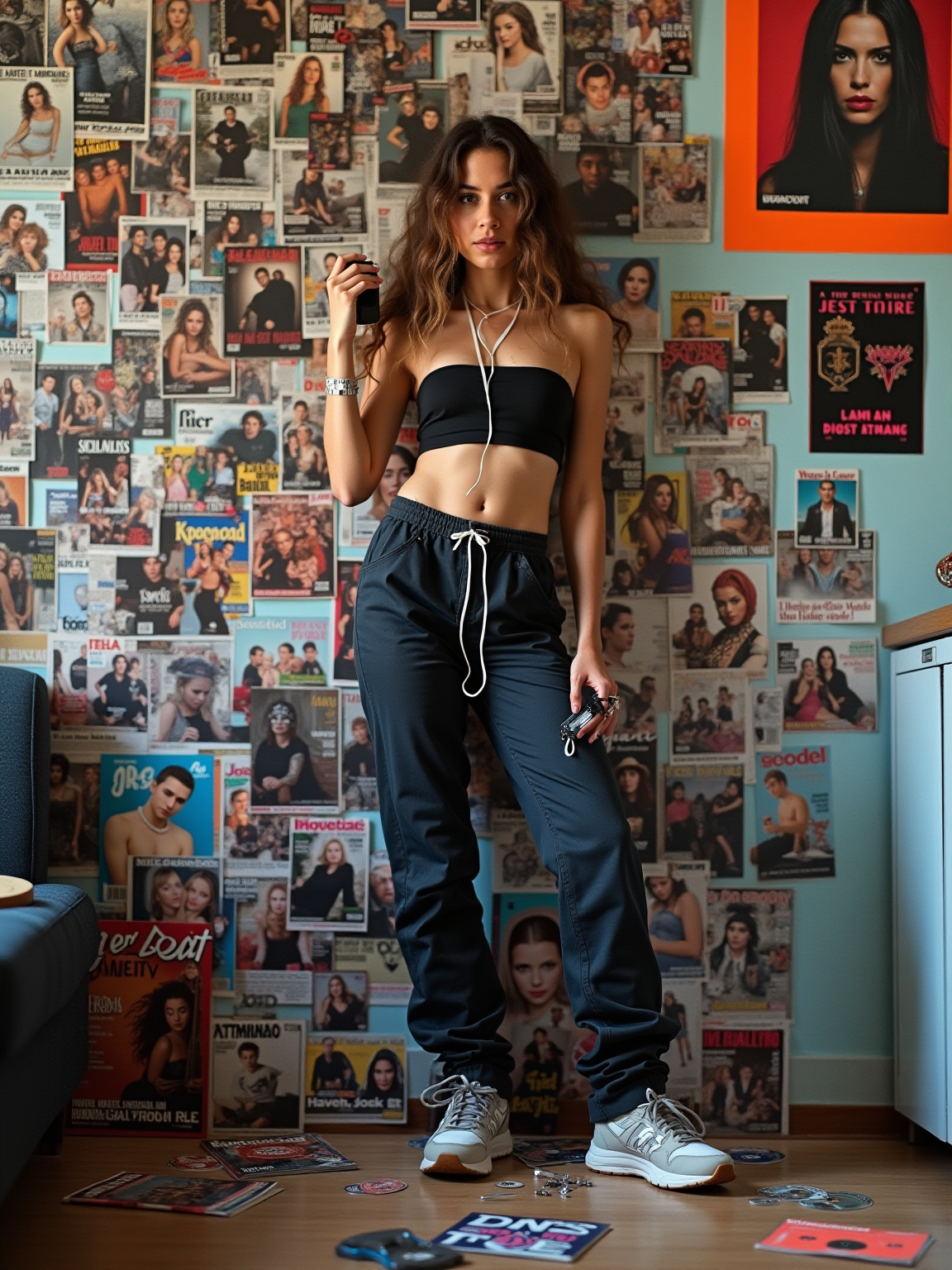 model leaning against a wall covered in teen magazine cutouts and CD inserts, wearing a tube top with cargo pants and chunky sneakers , holding a Walkman with tangled earbuds, scattered Tiger Beat and J-14 magazines on the floor, blacklight posters of Nu Metal bands
