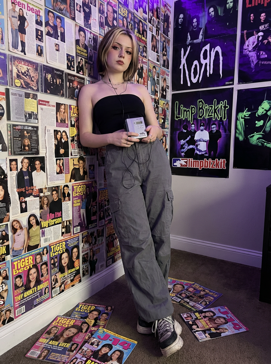 model leaning against a wall covered in teen magazine cutouts and CD inserts, wearing a tube top with cargo pants and chunky sneakers , holding a Walkman with tangled earbuds, scattered Tiger Beat and J-14 magazines on the floor, blacklight posters of Nu Metal bands