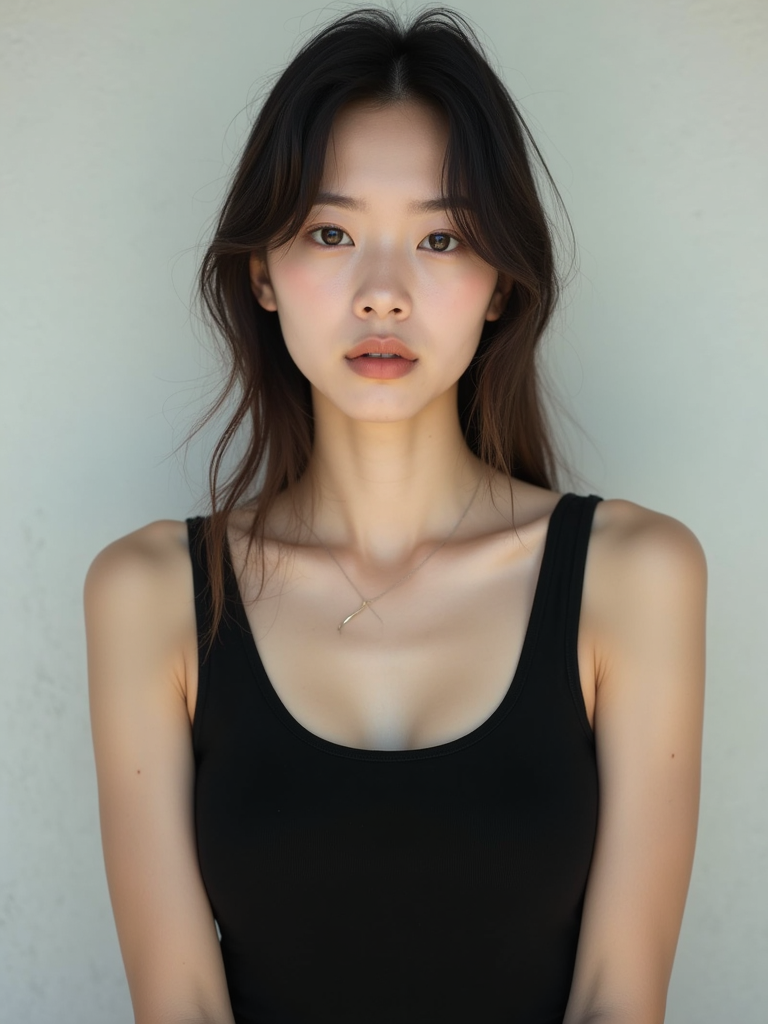 model looking straight into camera with mouth closed and no emotion. plain background. wearing black tank top