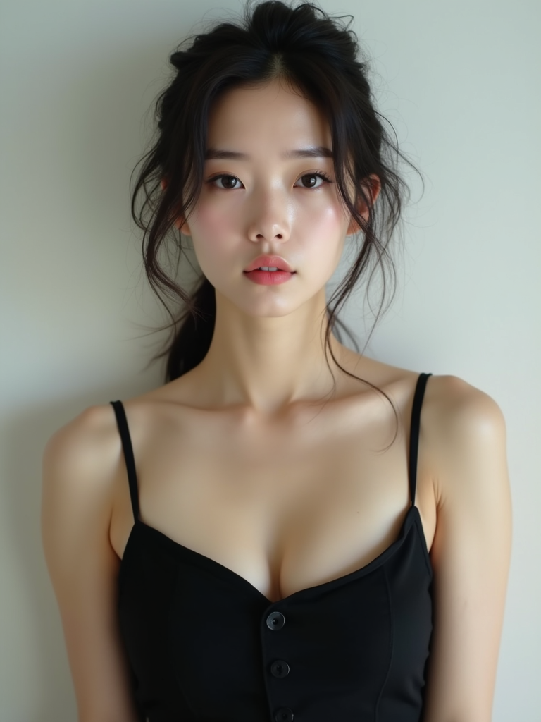 model looking straight into camera with mouth closed and no emotion. plain background. wearing black tank top
