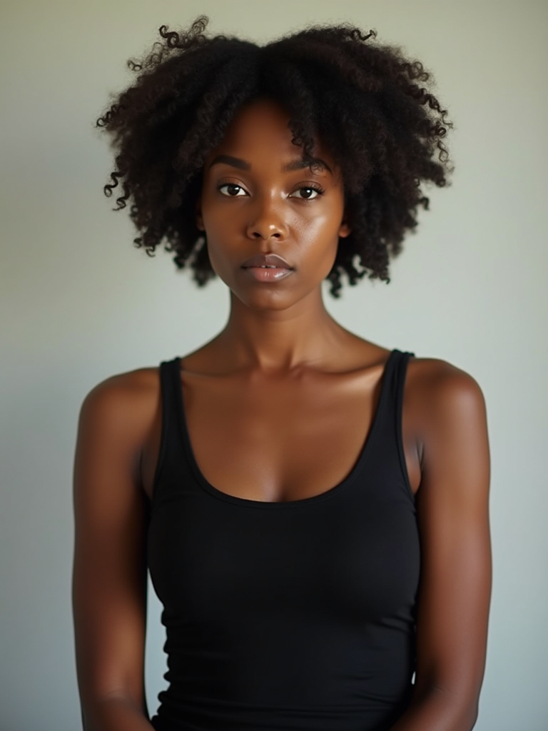 model looking straight into camera with mouth closed and no emotion. plain background. wearing black tank top