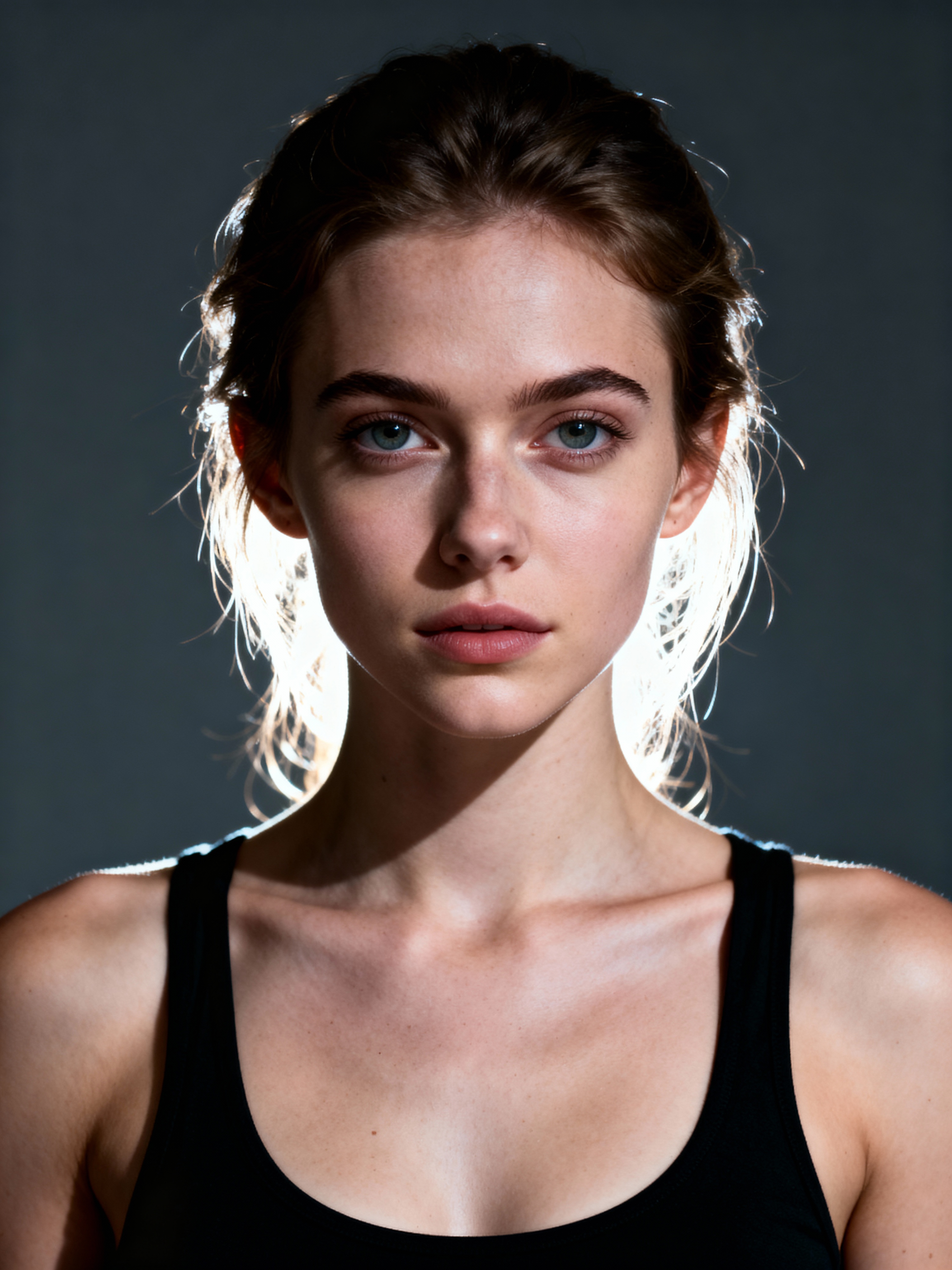 model looking straight into camera with mouth closed and no emotion. plain background. wearing black tank top
