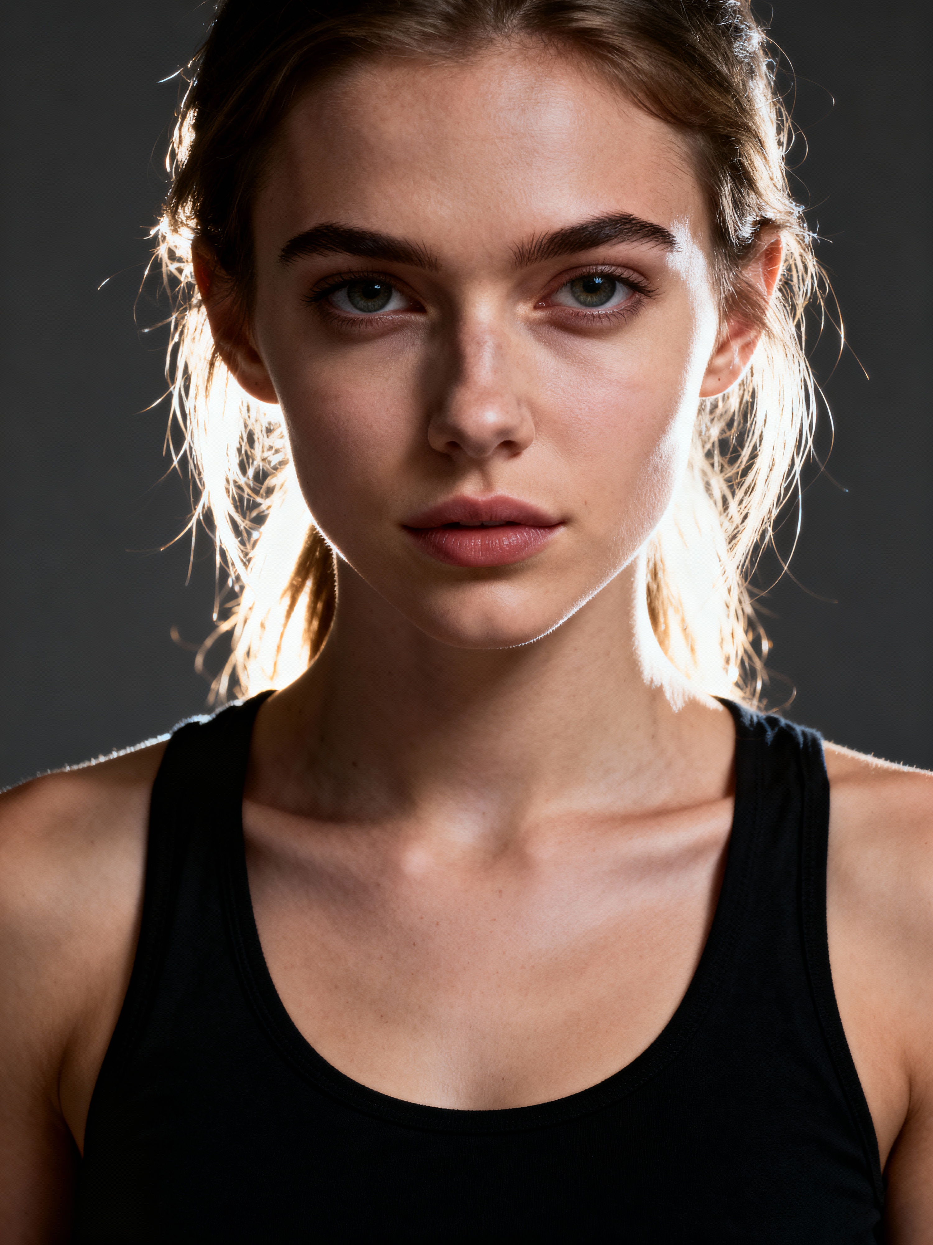 model looking straight into camera with mouth closed and no emotion. plain background. wearing black tank top