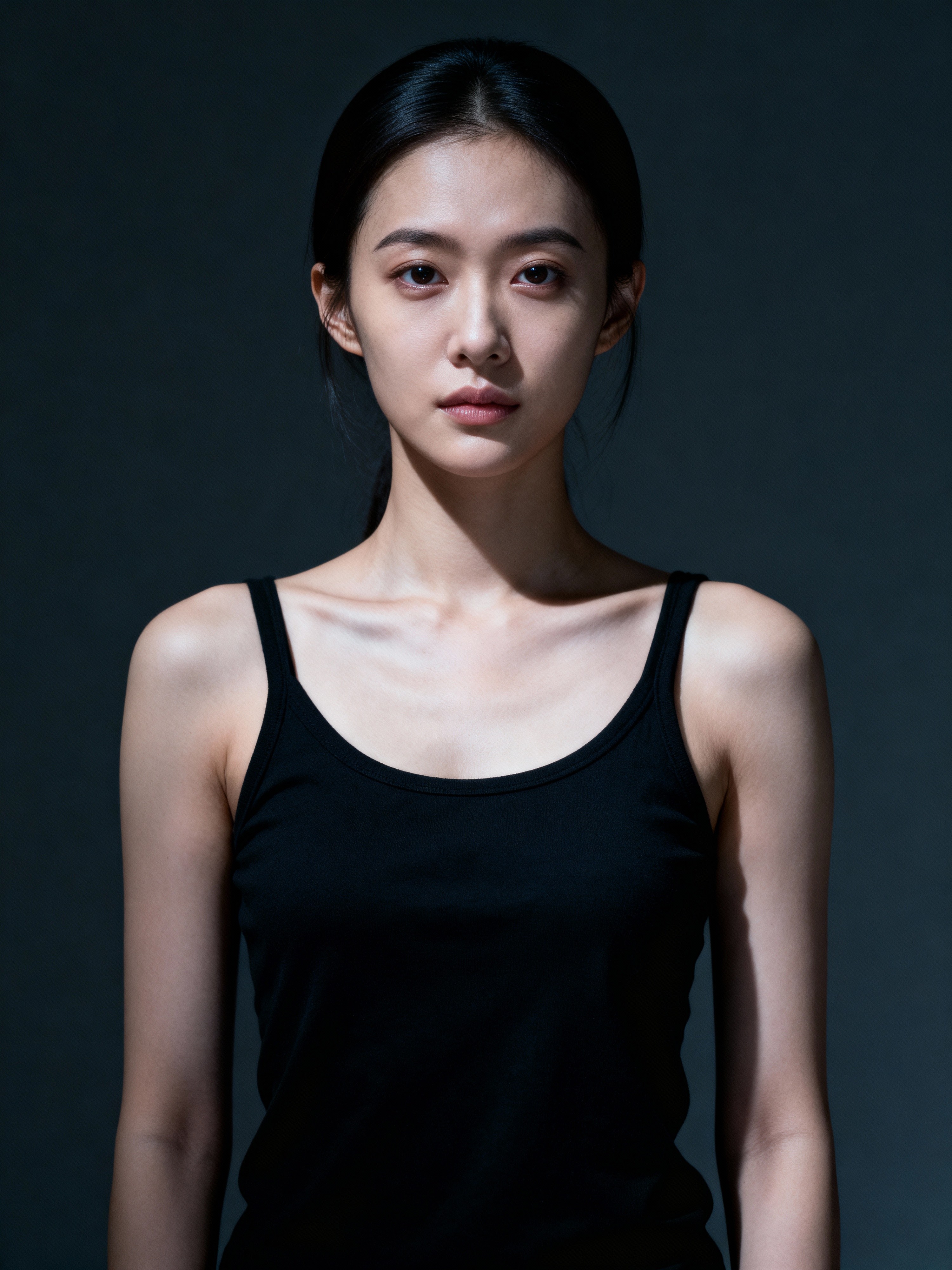 model looking straight into camera with mouth closed and no emotion. plain background. wearing black tank top
