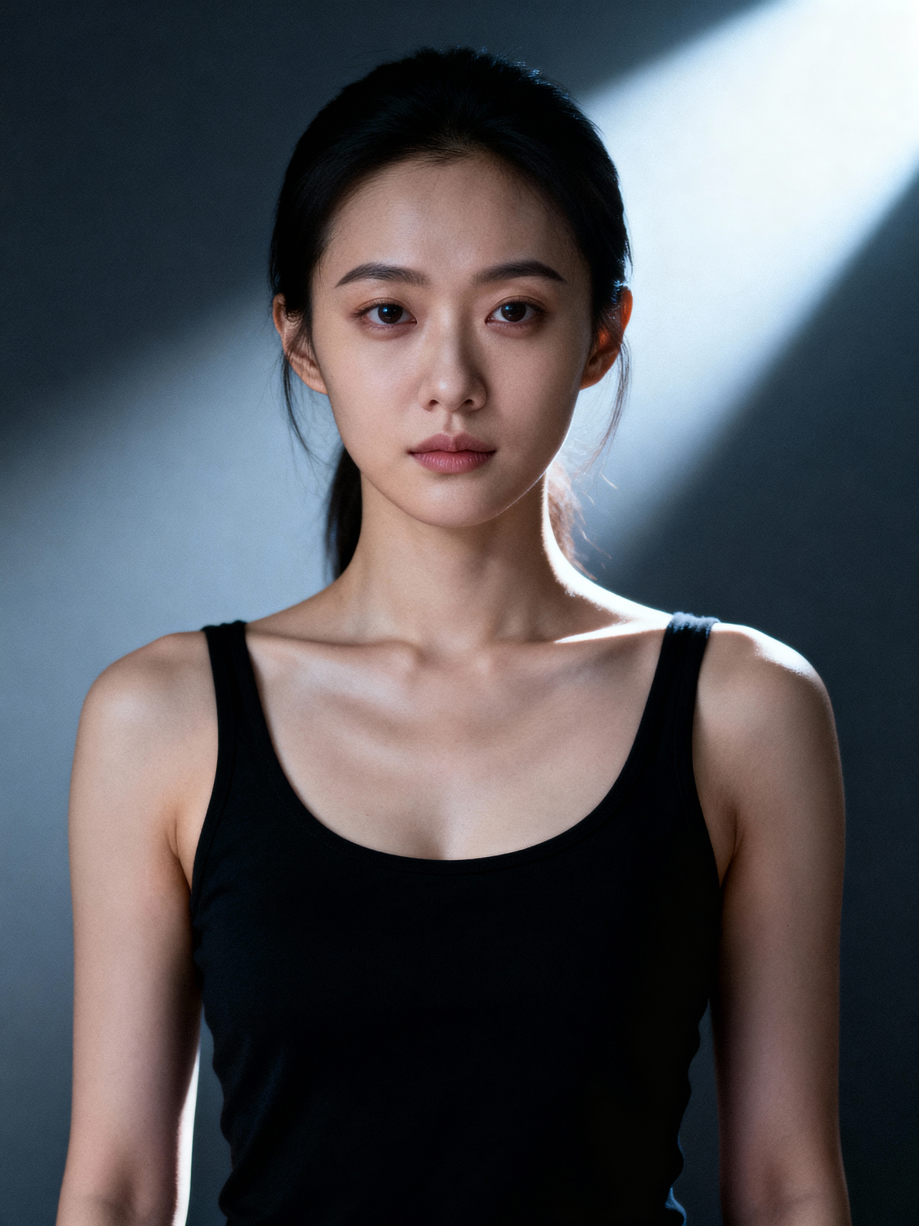 model looking straight into camera with mouth closed and no emotion. plain background. wearing black tank top